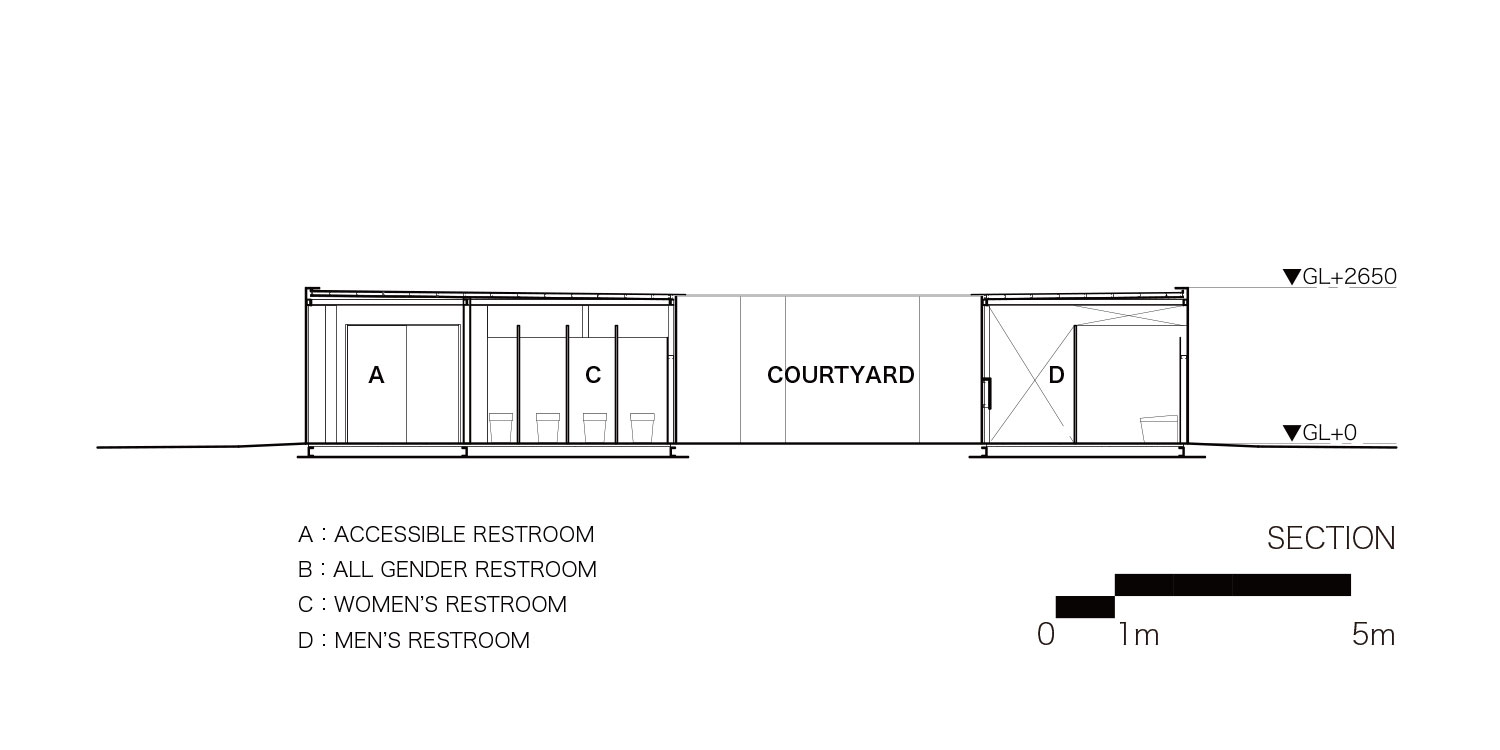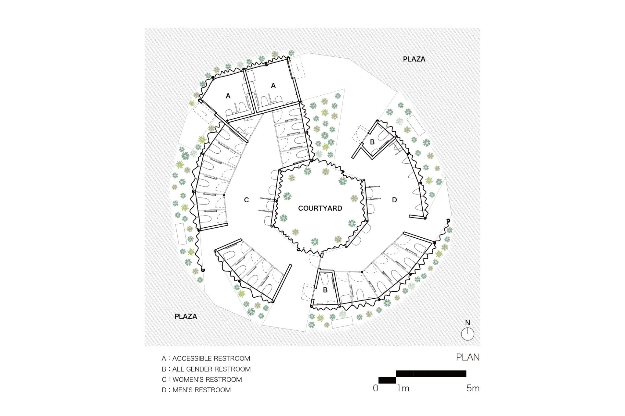 象徴的な建築群に囲まれた広場という敷地に対して、背景化するように周囲の現象のみを浮かび上がらせる明確なかたちをもたない建築を構想した。そして、とてもオープンな場に建つトイレとして、プライバシーを確保しつつもとても光に満ちた空間を求めた。