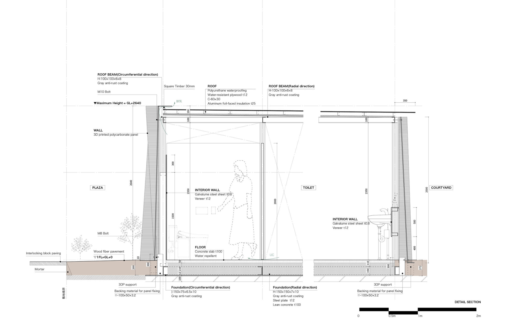 鈴木淳平・村部塁・溝端友輔による、大阪・関西万博の「島の蜃気楼(トイレ7)」。“象徴的な建築群”に囲まれた広場での計画。“周囲の現象のみ”を際立たせる在り方を求め、“蜘蛛の巣状”の平面形で“3Dプリント製のポリカパネル”を纏った建築を考案。環境との関係の中で存在が浮かび上がる断面詳細図 image©鈴木淳平+村部塁+溝端友輔