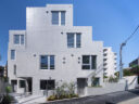 “成熟した住宅地”での計画です。建築家は、都市の密度と良好な住環境の両立を求め、“雁行する平面”と“壇状の断面”でヴォリュームを分節する建築を考案しました。そして、採光や眺望などの空間的豊かさを創出しつつ周辺への圧迫感も軽減しています。
