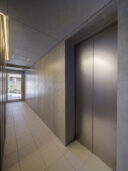 黒川智之建築設計事務所による、東京・渋谷区の「広尾の集合住宅」。“成熟した住宅地”での計画。都市の密度と良好な住環境の両立を求め、“雁行する平面”と“壇状の断面”でヴォリュームを分節する建築を考案。採光や眺望などの空間的豊かさを創出しつつ周辺への圧迫感も軽減1階、共用通路 photo©中山保寛