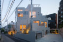 黒川智之建築設計事務所による、東京・渋谷区の「広尾の集合住宅」。“成熟した住宅地”での計画。都市の密度と良好な住環境の両立を求め、“雁行する平面”と“壇状の断面”でヴォリュームを分節する建築を考案。採光や眺望などの空間的豊かさを創出しつつ周辺への圧迫感も軽減外観、東側の道路より見る。夜景 photo©中山保寛