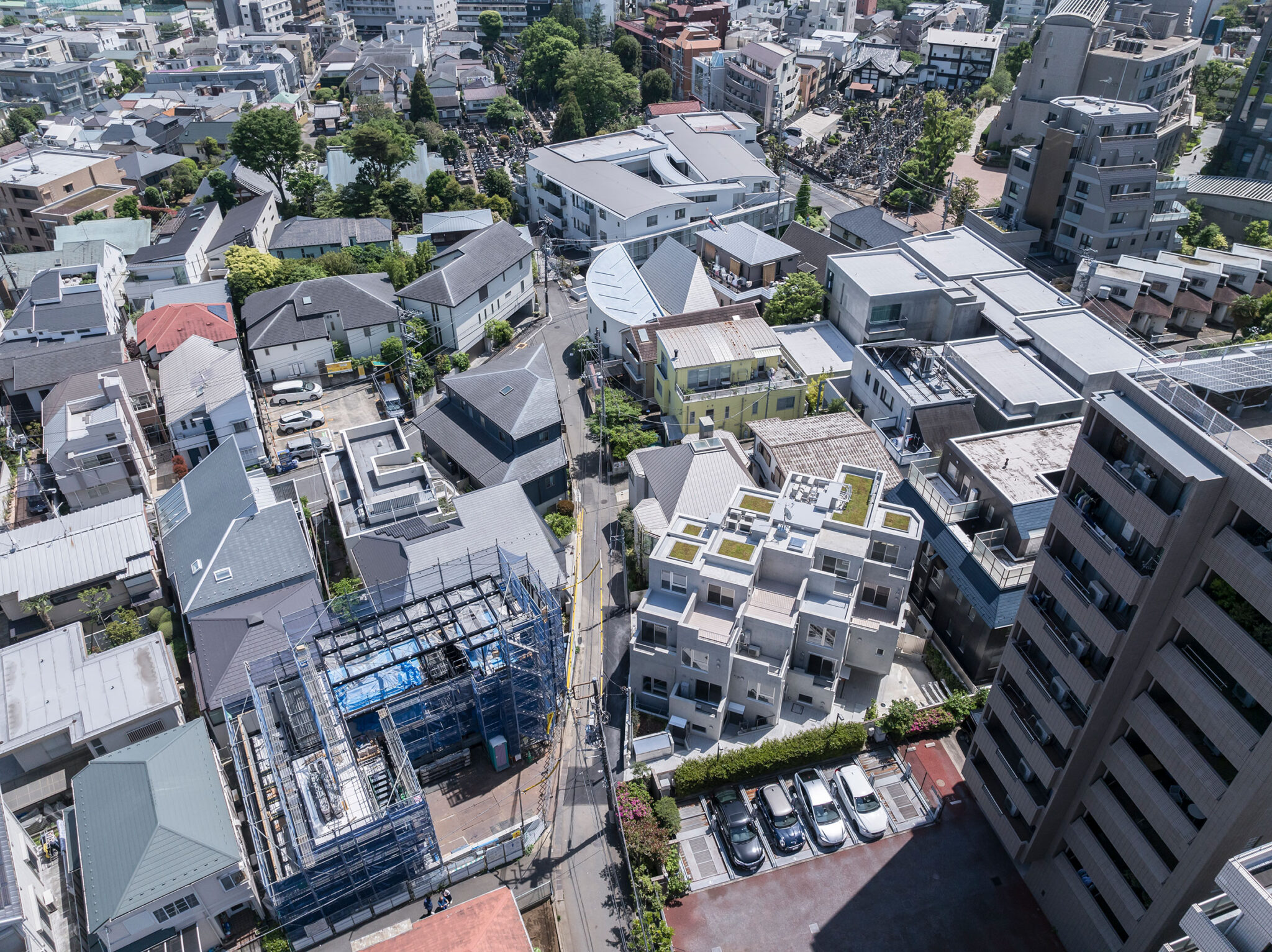 黒川智之建築設計事務所による、東京・渋谷区の「広尾の集合住宅」。“成熟した住宅地”での計画。都市の密度と良好な住環境の両立を求め、“雁行する平面”と“壇状の断面”でヴォリュームを分節する建築を考案。採光や眺望などの空間的豊かさを創出しつつ周辺への圧迫感も軽減俯瞰、北側より見下ろす。 photo©中山保寛