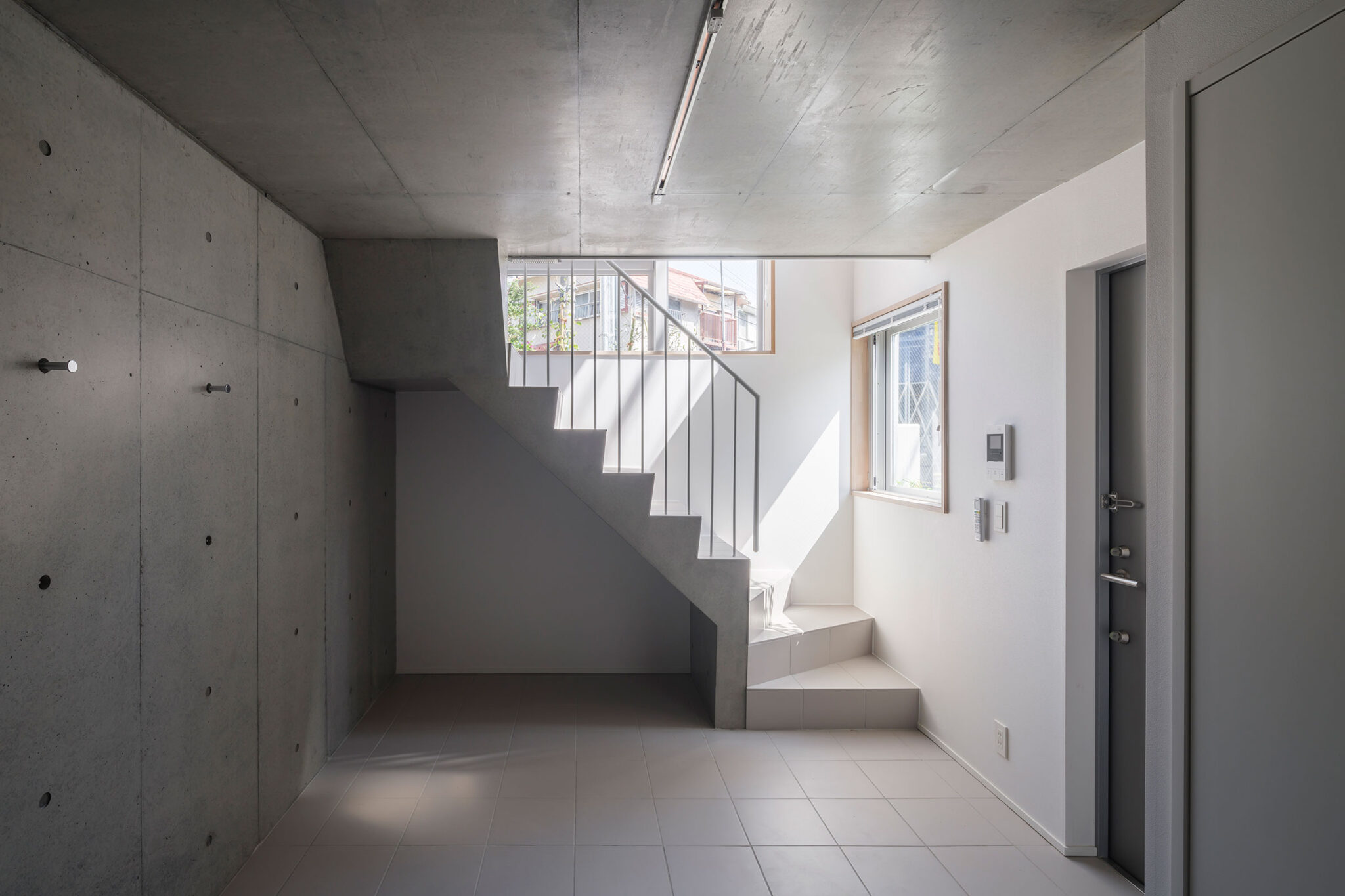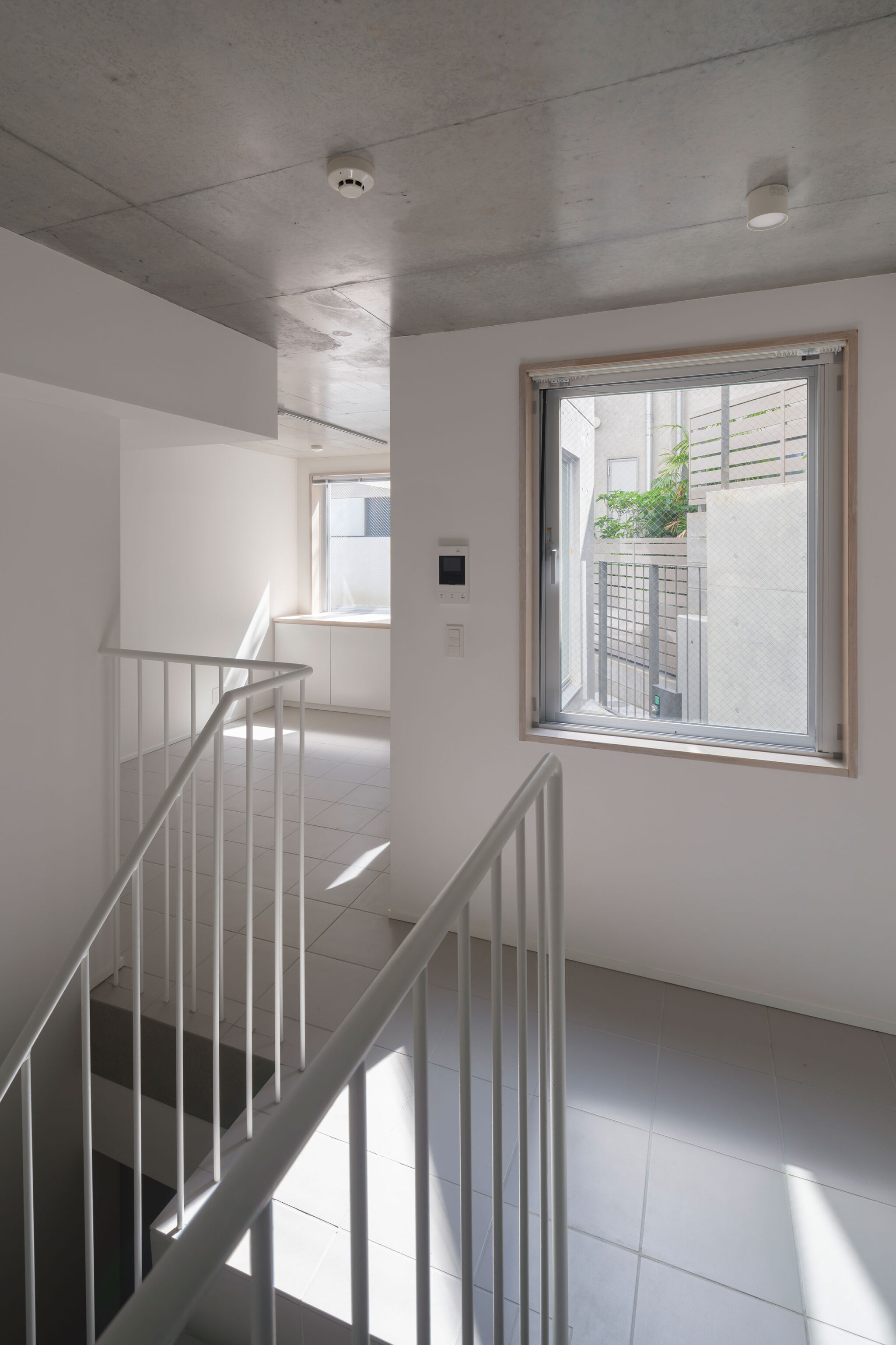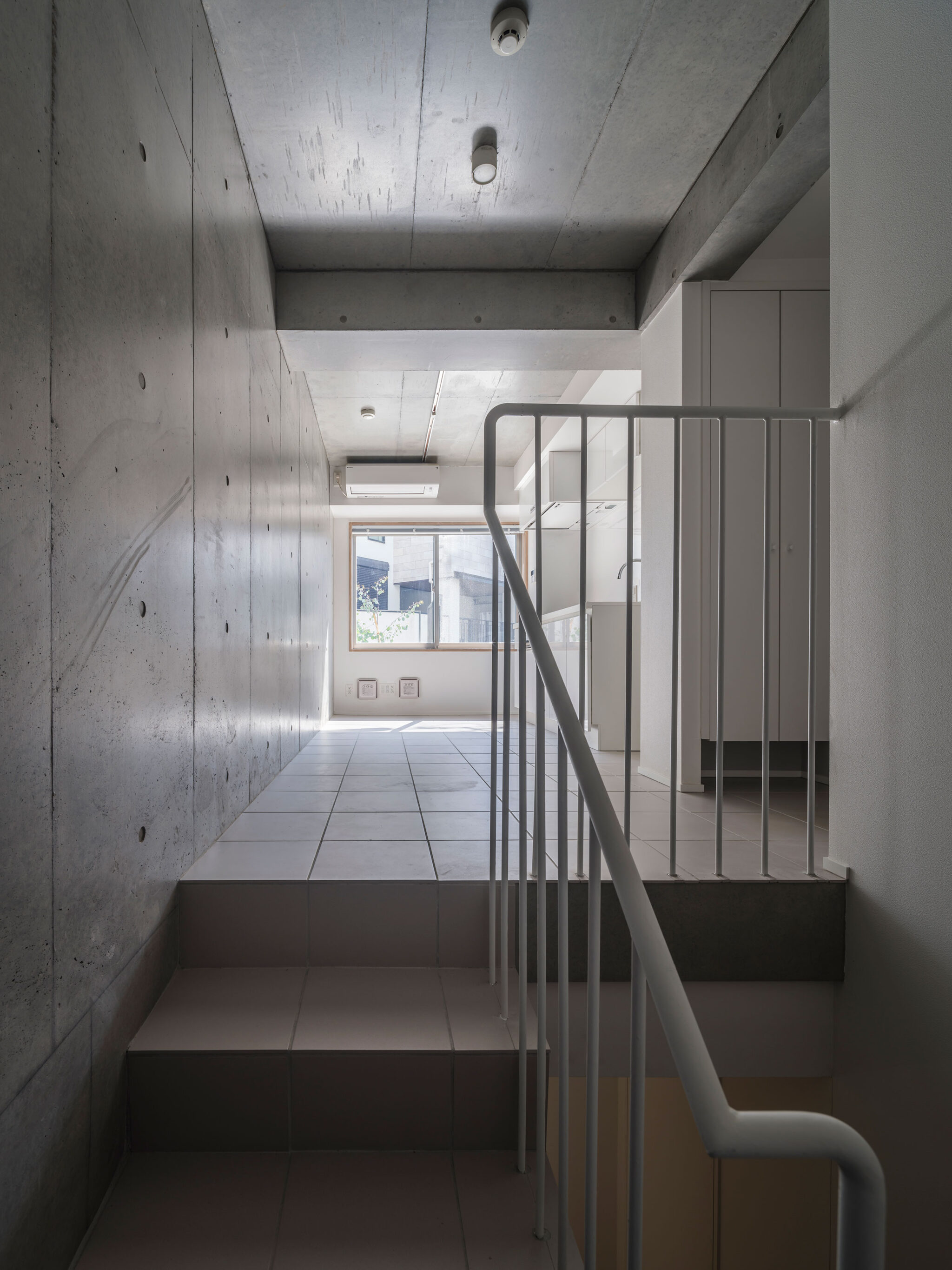 黒川智之建築設計事務所による、東京・渋谷区の「広尾の集合住宅」。“成熟した住宅地”での計画。都市の密度と良好な住環境の両立を求め、“雁行する平面”と“壇状の断面”でヴォリュームを分節する建築を考案。採光や眺望などの空間的豊かさを創出しつつ周辺への圧迫感も軽減1階、共用通路 photo©中山保寛