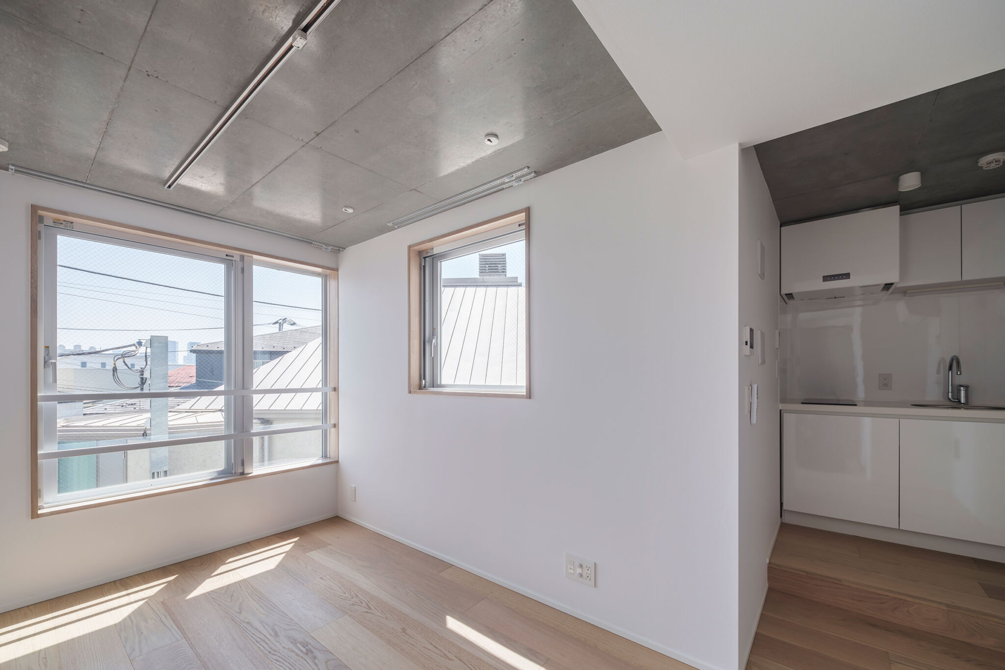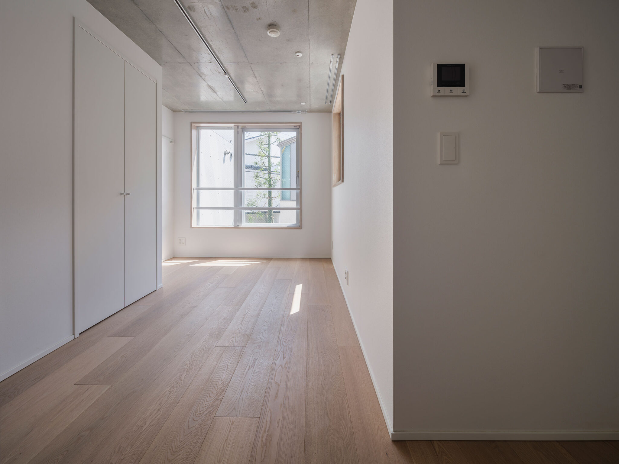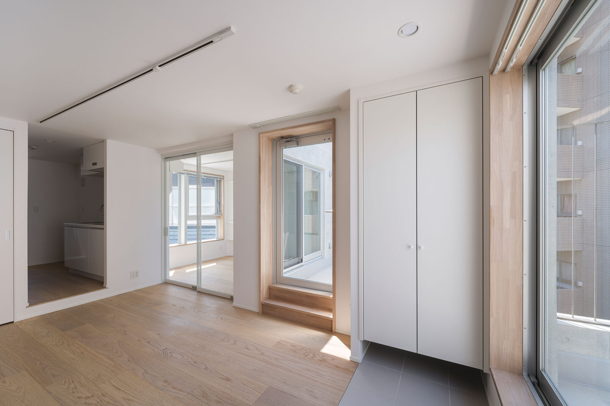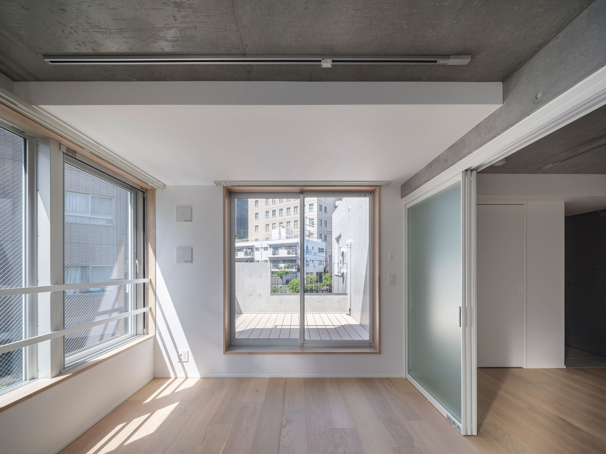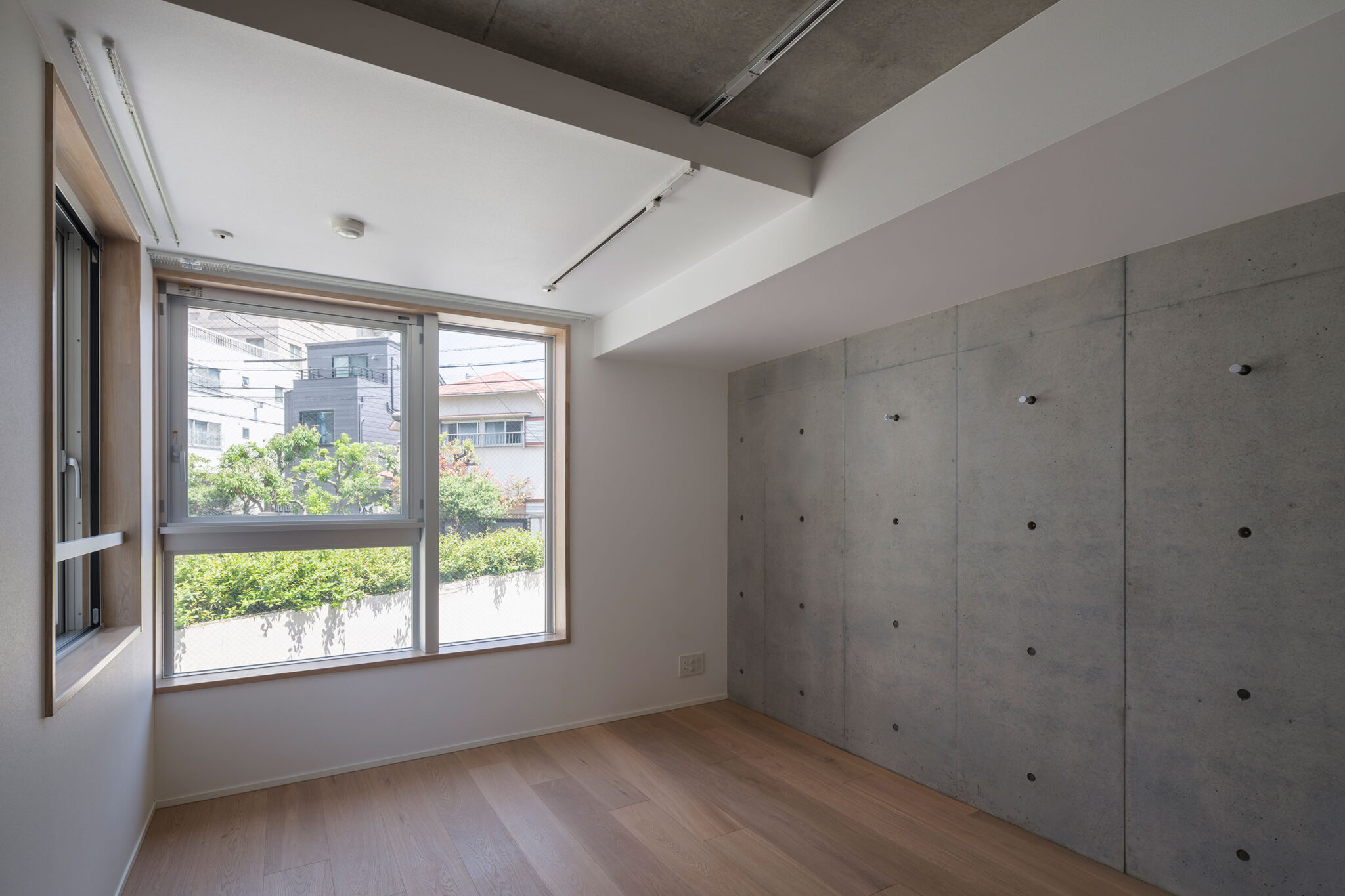 黒川智之建築設計事務所による、東京・渋谷区の「広尾の集合住宅」。“成熟した住宅地”での計画。都市の密度と良好な住環境の両立を求め、“雁行する平面”と“壇状の断面”でヴォリュームを分節する建築を考案。採光や眺望などの空間的豊かさを創出しつつ周辺への圧迫感も軽減2階、住戸203 photo©中山保寛