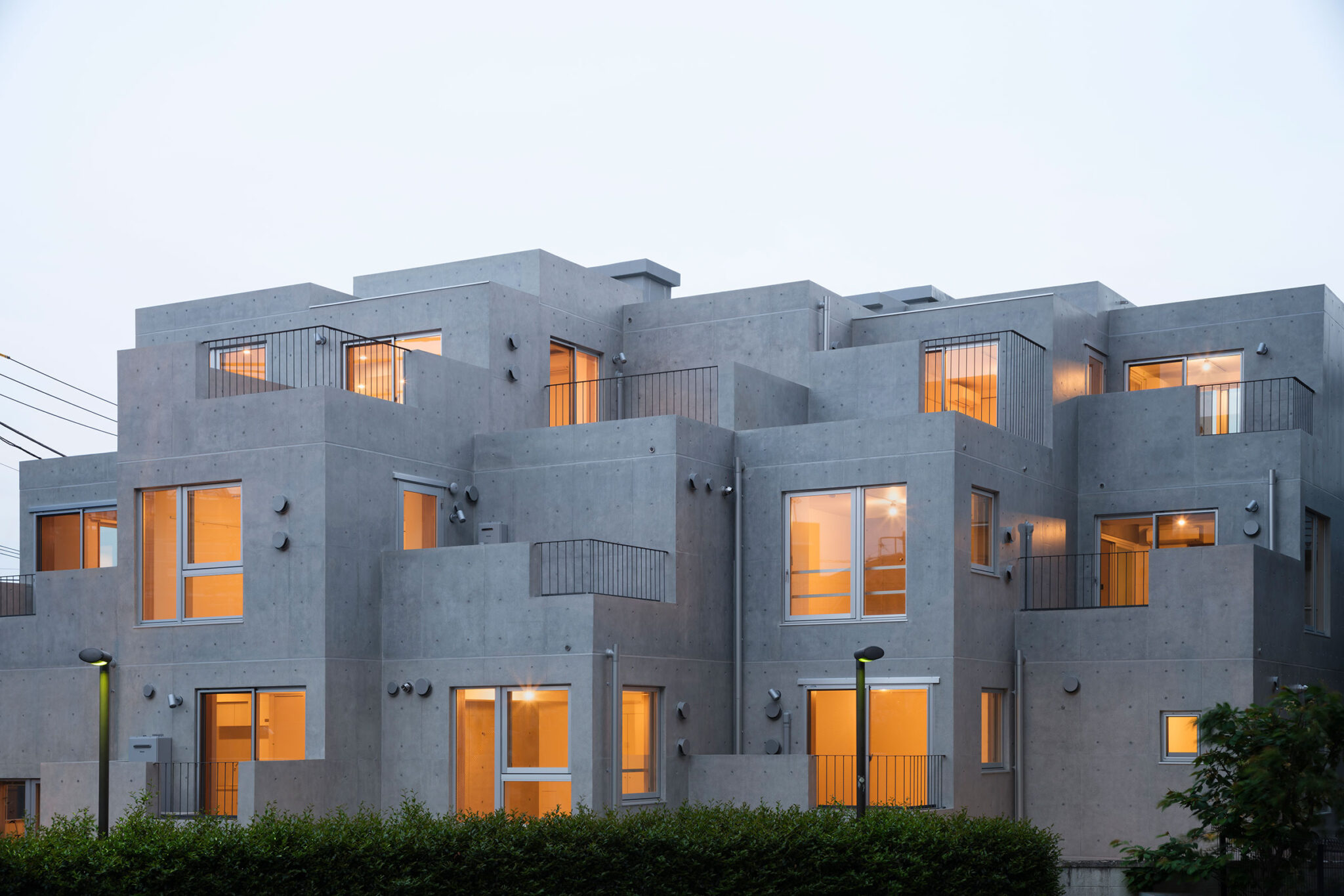 黒川智之建築設計事務所による、東京・渋谷区の「広尾の集合住宅」。“成熟した住宅地”での計画。都市の密度と良好な住環境の両立を求め、“雁行する平面”と“壇状の断面”でヴォリュームを分節する建築を考案。採光や眺望などの空間的豊かさを創出しつつ周辺への圧迫感も軽減外観、北西側より見る。夕景 photo©中山保寛