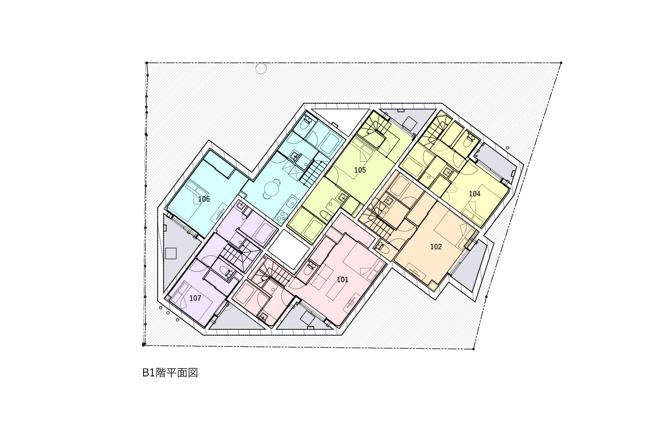 黒川智之建築設計事務所による、東京・渋谷区の「広尾の集合住宅」。“成熟した住宅地”での計画。都市の密度と良好な住環境の両立を求め、“雁行する平面”と“壇状の断面”でヴォリュームを分節する建築を考案。採光や眺望などの空間的豊かさを創出しつつ周辺への圧迫感も軽減地下1階平面図 image©黒川智之建築設計事務所