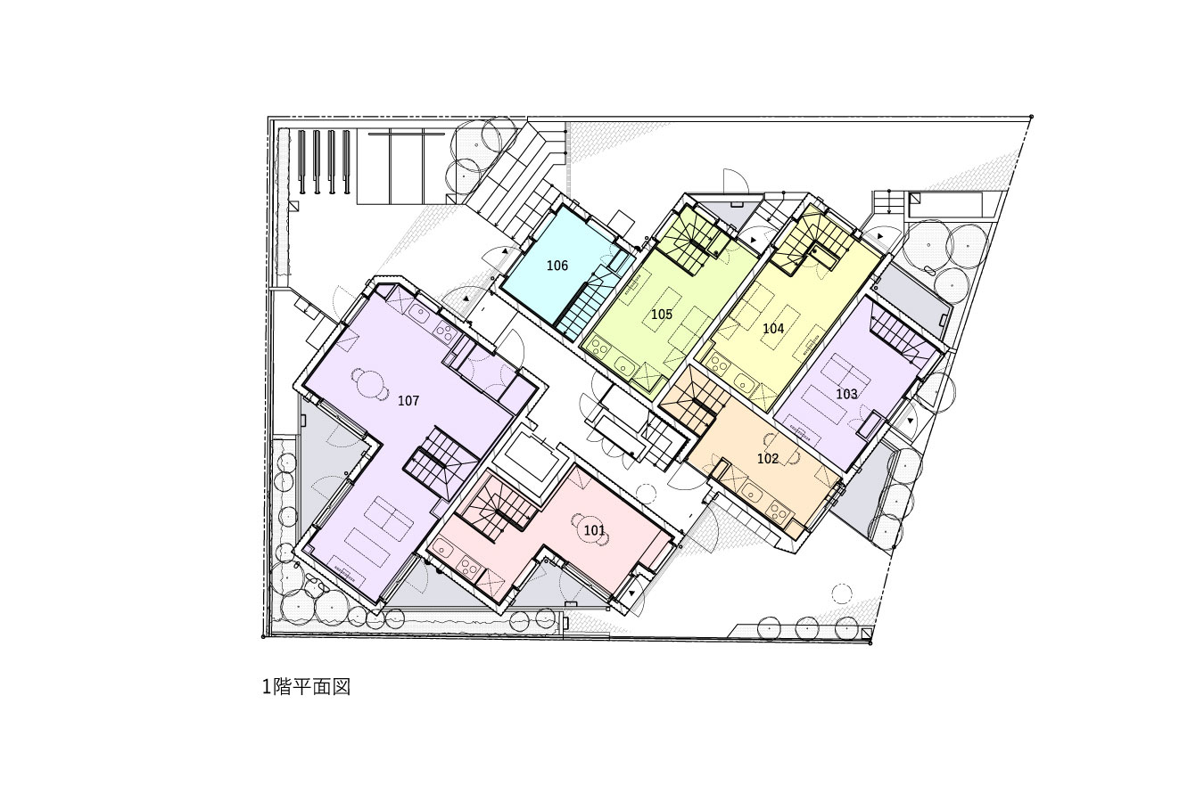 黒川智之建築設計事務所による、東京・渋谷区の「広尾の集合住宅」。“成熟した住宅地”での計画。都市の密度と良好な住環境の両立を求め、“雁行する平面”と“壇状の断面”でヴォリュームを分節する建築を考案。採光や眺望などの空間的豊かさを創出しつつ周辺への圧迫感も軽減1階平面図 image©黒川智之建築設計事務所