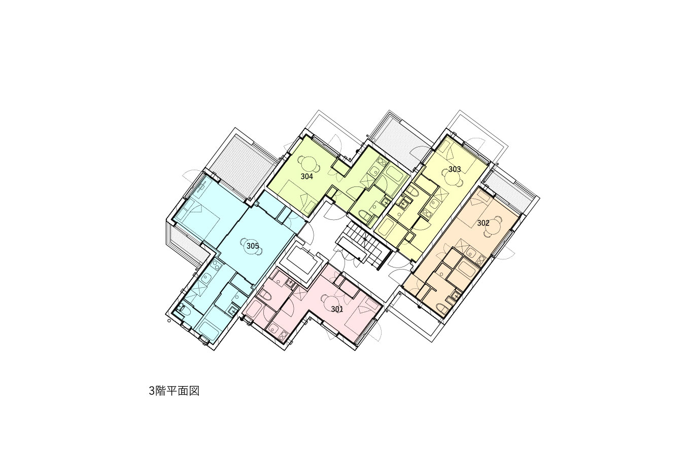 黒川智之建築設計事務所による、東京・渋谷区の「広尾の集合住宅」。“成熟した住宅地”での計画。都市の密度と良好な住環境の両立を求め、“雁行する平面”と“壇状の断面”でヴォリュームを分節する建築を考案。採光や眺望などの空間的豊かさを創出しつつ周辺への圧迫感も軽減3階平面図 image©黒川智之建築設計事務所