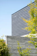 押山剛司建築設計事務所による「栃木の家」。戸建てと田んぼが入り混じる住宅街の敷地。植物や庭いじりが好きな施主の為に、個性的な複数の庭と建築が“絡み合う”ような平面構成を志向。箱形をベースとして“スタックとシフト”を繰り返して造り上げる外観、外壁の詳細 photo©渡邊崚生