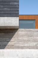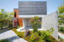 押山剛司建築設計事務所による「栃木の家」。戸建てと田んぼが入り混じる住宅街の敷地。植物や庭いじりが好きな施主の為に、個性的な複数の庭と建築が“絡み合う”ような平面構成を志向。箱形をベースとして“スタックとシフト”を繰り返して造り上げる塀の詳細 photo©渡邊崚生