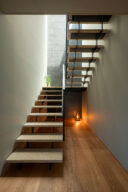 押山剛司建築設計事務所による「栃木の家」。戸建てと田んぼが入り混じる住宅街の敷地。植物や庭いじりが好きな施主の為に、個性的な複数の庭と建築が“絡み合う”ような平面構成を志向。箱形をベースとして“スタックとシフト”を繰り返して造り上げる1階、ホール1から2階への階段を見る。 photo©渡邊崚生