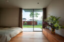 押山剛司建築設計事務所による「栃木の家」。戸建てと田んぼが入り混じる住宅街の敷地。植物や庭いじりが好きな施主の為に、個性的な複数の庭と建築が“絡み合う”ような平面構成を志向。箱形をベースとして“スタックとシフト”を繰り返して造り上げる1階、寝室 photo©渡邊崚生