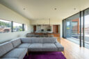 押山剛司建築設計事務所による「栃木の家」。戸建てと田んぼが入り混じる住宅街の敷地。植物や庭いじりが好きな施主の為に、個性的な複数の庭と建築が“絡み合う”ような平面構成を志向。箱形をベースとして“スタックとシフト”を繰り返して造り上げる2階、ダイニングからリビングを見る。 photo©渡邊崚生