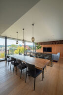 押山剛司建築設計事務所による「栃木の家」。戸建てと田んぼが入り混じる住宅街の敷地。植物や庭いじりが好きな施主の為に、個性的な複数の庭と建築が“絡み合う”ような平面構成を志向。箱形をベースとして“スタックとシフト”を繰り返して造り上げる2階、リビングからダイニングとキッチンを見る。 photo©渡邊崚生