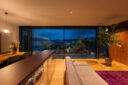 押山剛司建築設計事務所による「栃木の家」。戸建てと田んぼが入り混じる住宅街の敷地。植物や庭いじりが好きな施主の為に、個性的な複数の庭と建築が“絡み合う”ような平面構成を志向。箱形をベースとして“スタックとシフト”を繰り返して造り上げる2階、リビングからダイニングとキッチンを見る。夜景 photo©渡邊崚生