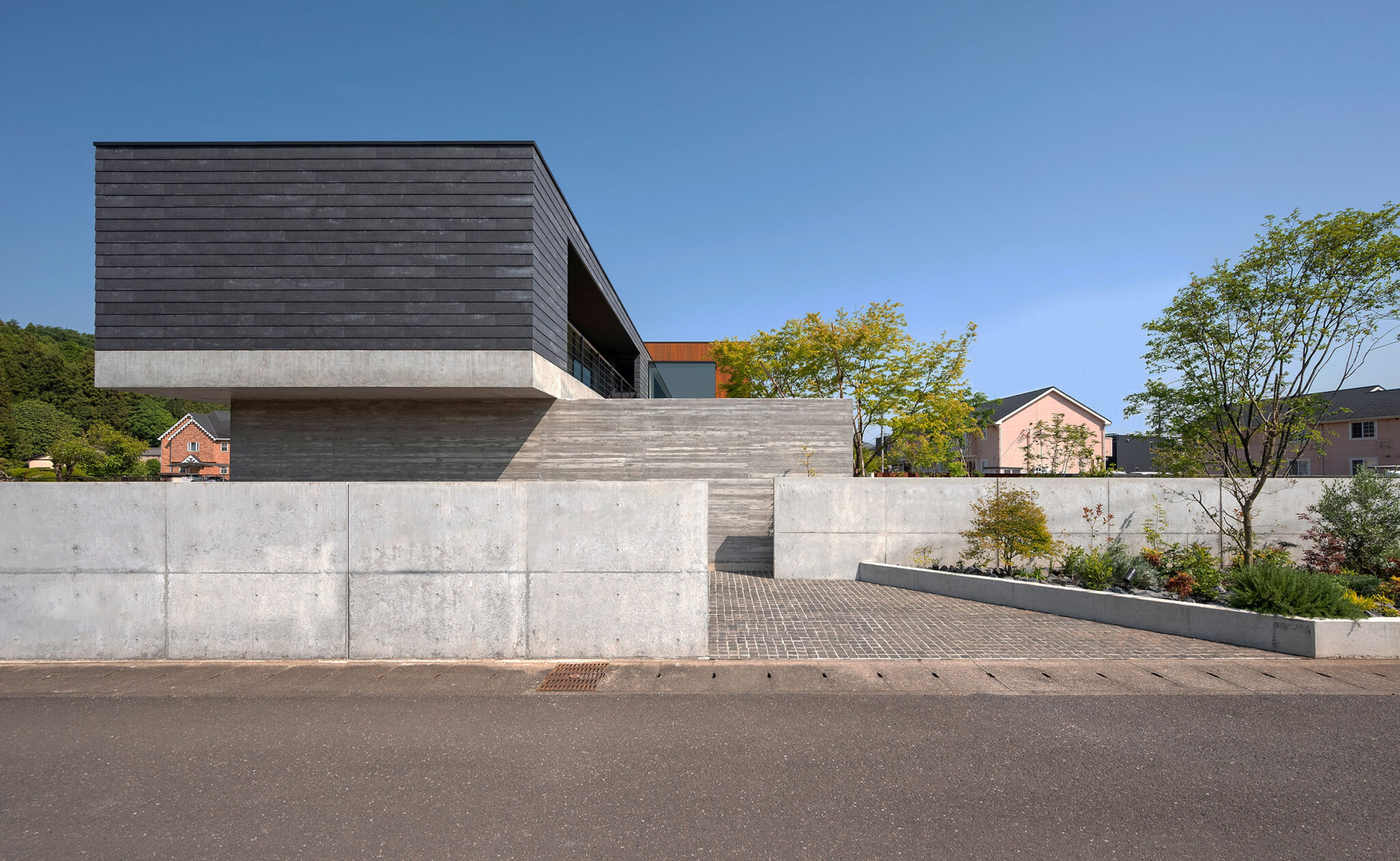 建築は施主の要望からシンプルな箱型とし、スタックとシフトの繰り返しで構成され、それと同時に外構の塀も同じようにシフトをしながら配置された。