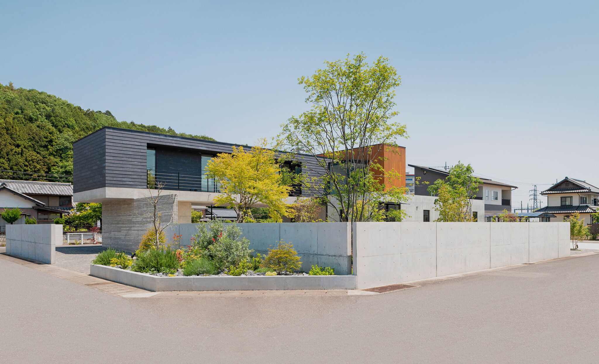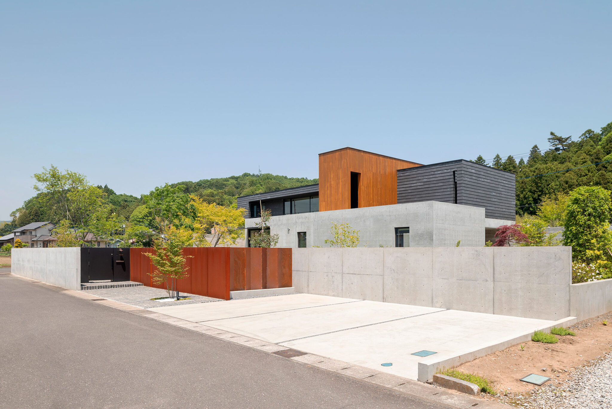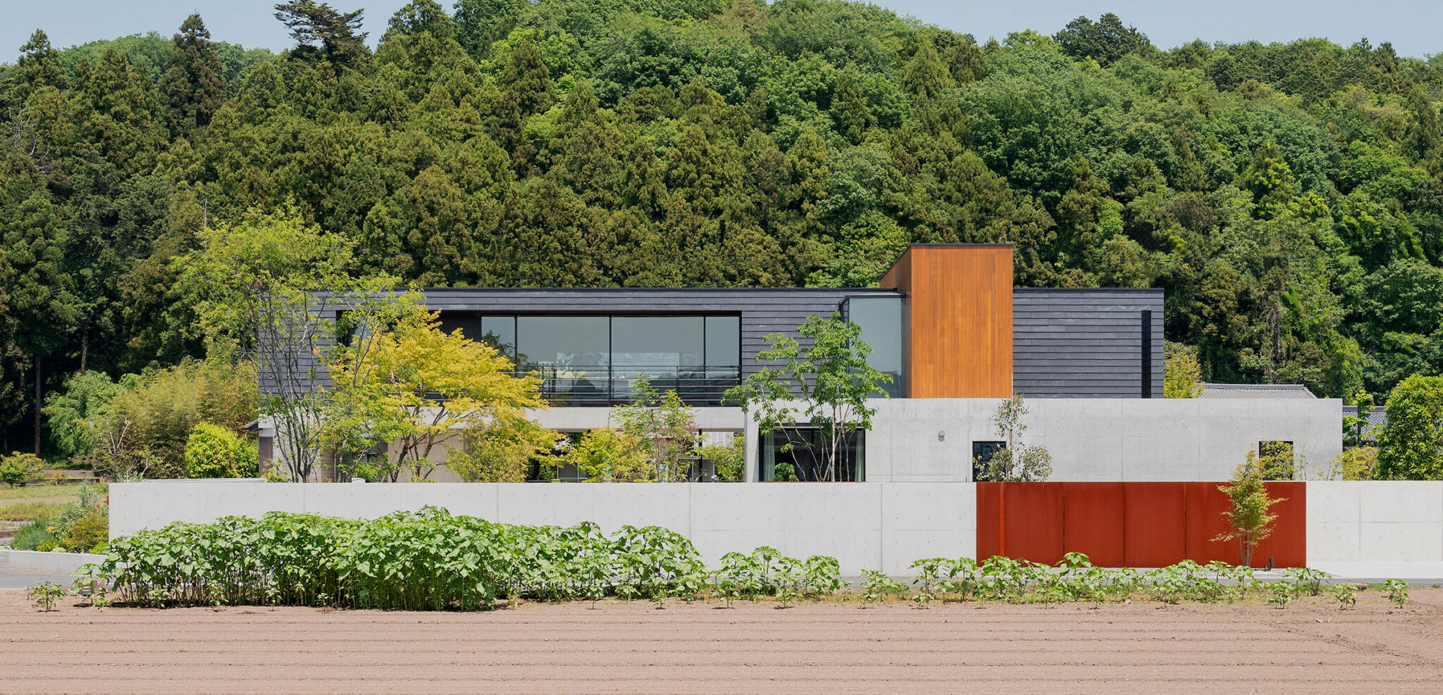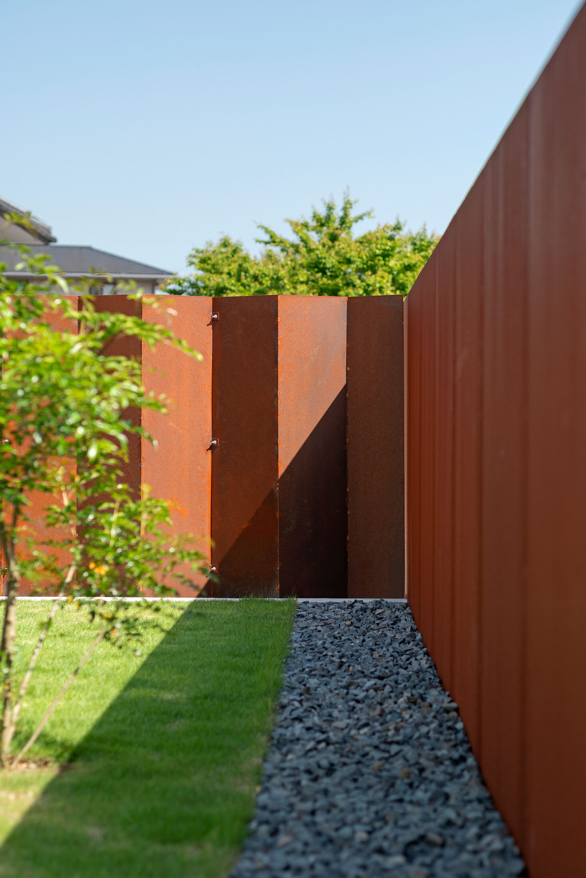 押山剛司建築設計事務所による「栃木の家」。戸建てと田んぼが入り混じる住宅街の敷地。植物や庭いじりが好きな施主の為に、個性的な複数の庭と建築が“絡み合う”ような平面構成を志向。箱形をベースとして“スタックとシフト”を繰り返して造り上げる塀の詳細 photo©渡邊崚生