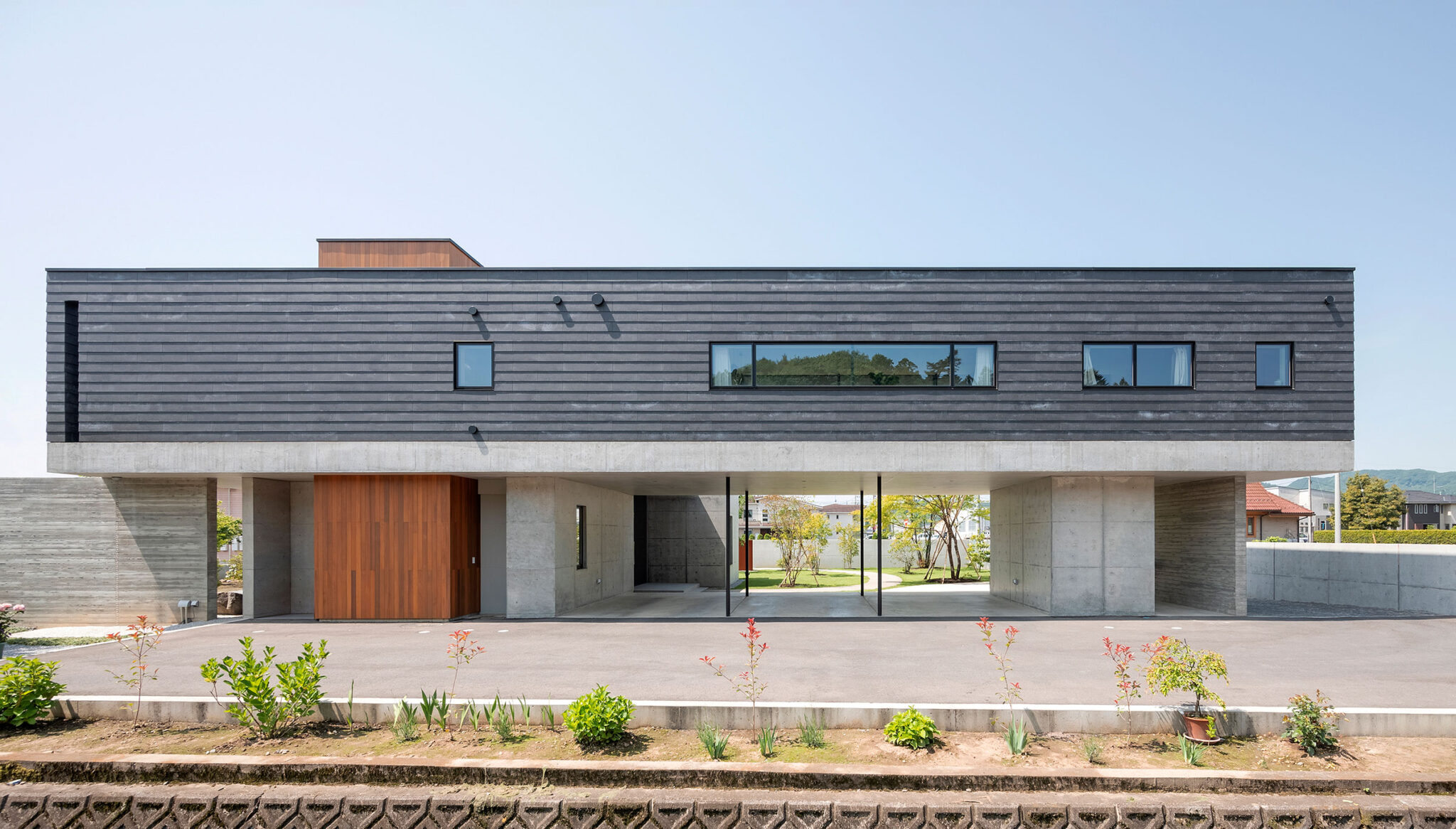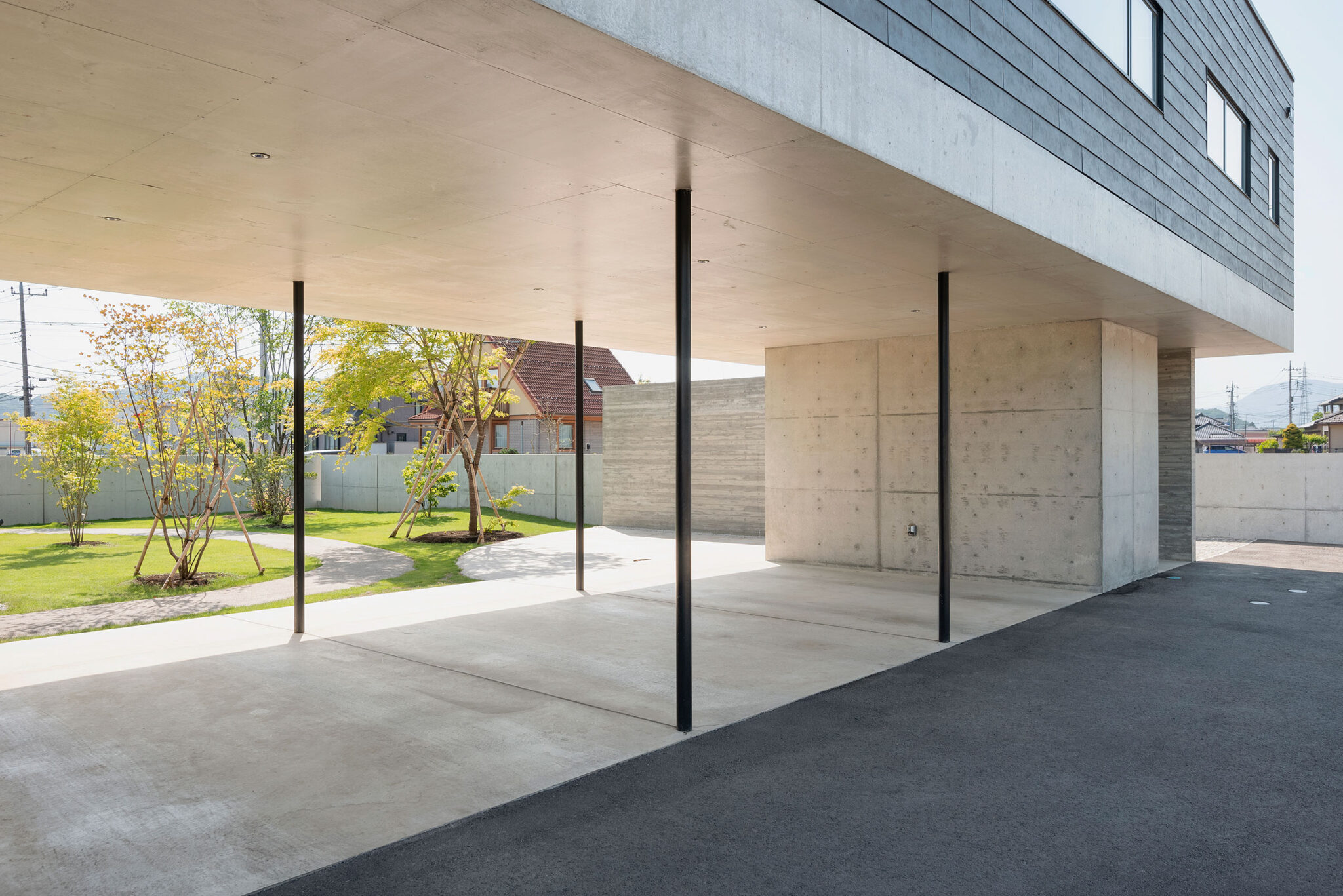押山剛司建築設計事務所による「栃木の家」。戸建てと田んぼが入り混じる住宅街の敷地。植物や庭いじりが好きな施主の為に、個性的な複数の庭と建築が“絡み合う”ような平面構成を志向。箱形をベースとして“スタックとシフト”を繰り返して造り上げる駐車場 photo©渡邊崚生