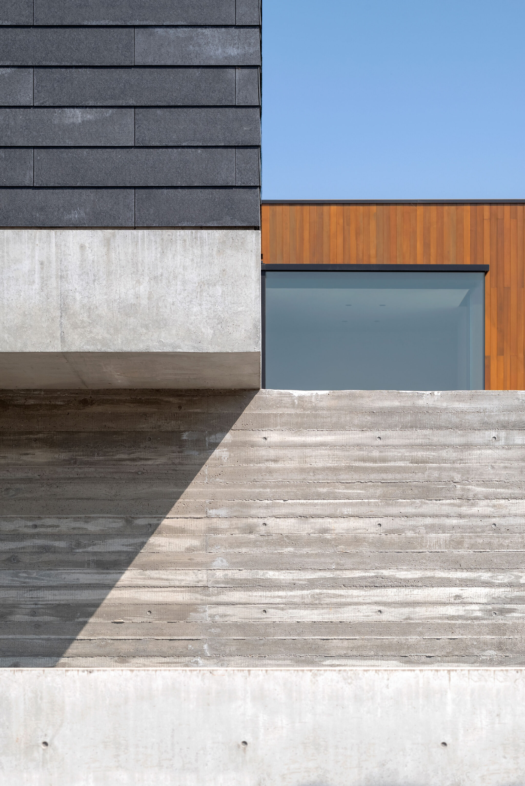 押山剛司建築設計事務所による「栃木の家」。戸建てと田んぼが入り混じる住宅街の敷地。植物や庭いじりが好きな施主の為に、個性的な複数の庭と建築が“絡み合う”ような平面構成を志向。箱形をベースとして“スタックとシフト”を繰り返して造り上げる外観、外壁の詳細 photo©渡邊崚生