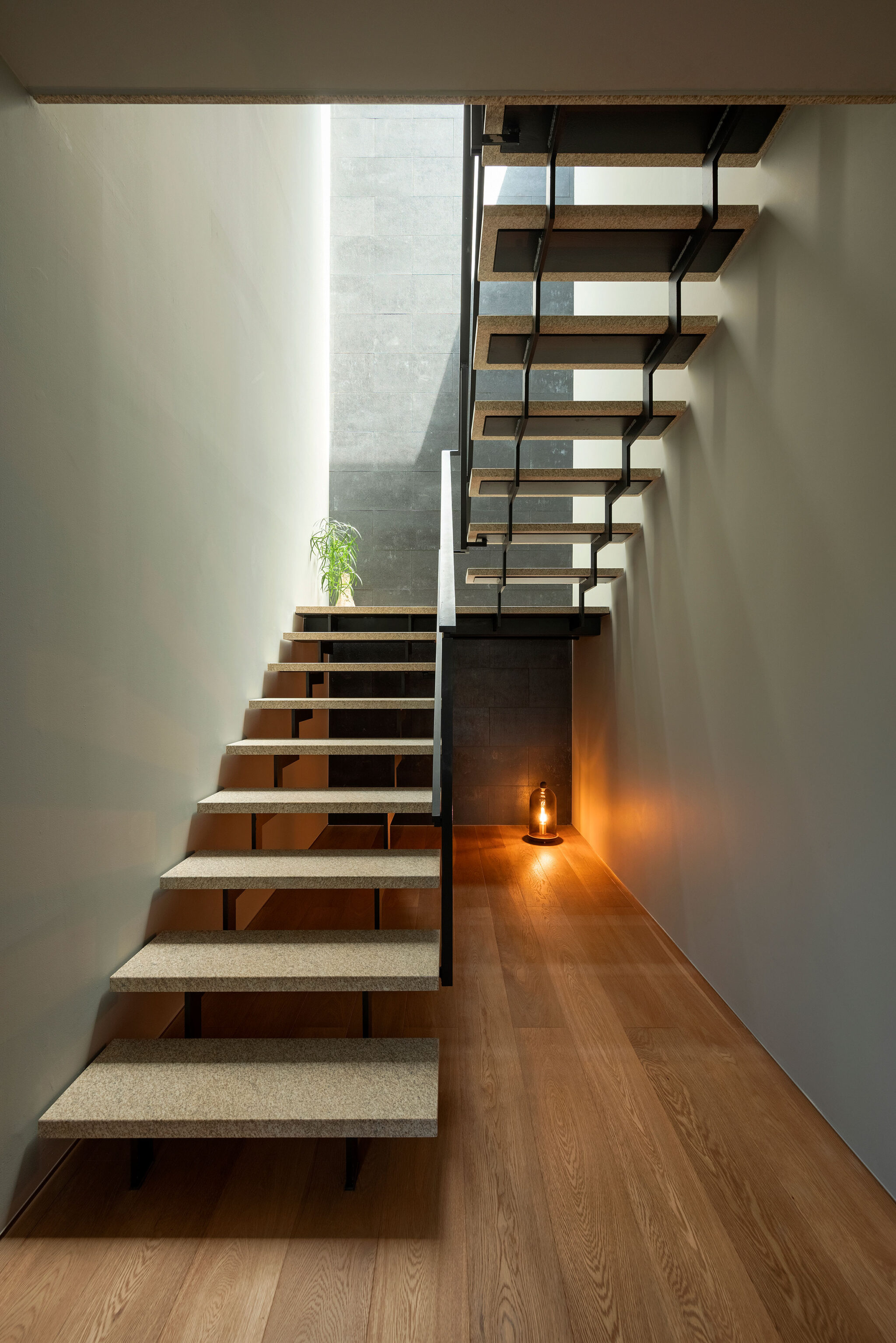 押山剛司建築設計事務所による「栃木の家」。戸建てと田んぼが入り混じる住宅街の敷地。植物や庭いじりが好きな施主の為に、個性的な複数の庭と建築が“絡み合う”ような平面構成を志向。箱形をベースとして“スタックとシフト”を繰り返して造り上げる1階、ホール1から2階への階段を見る。 photo©渡邊崚生