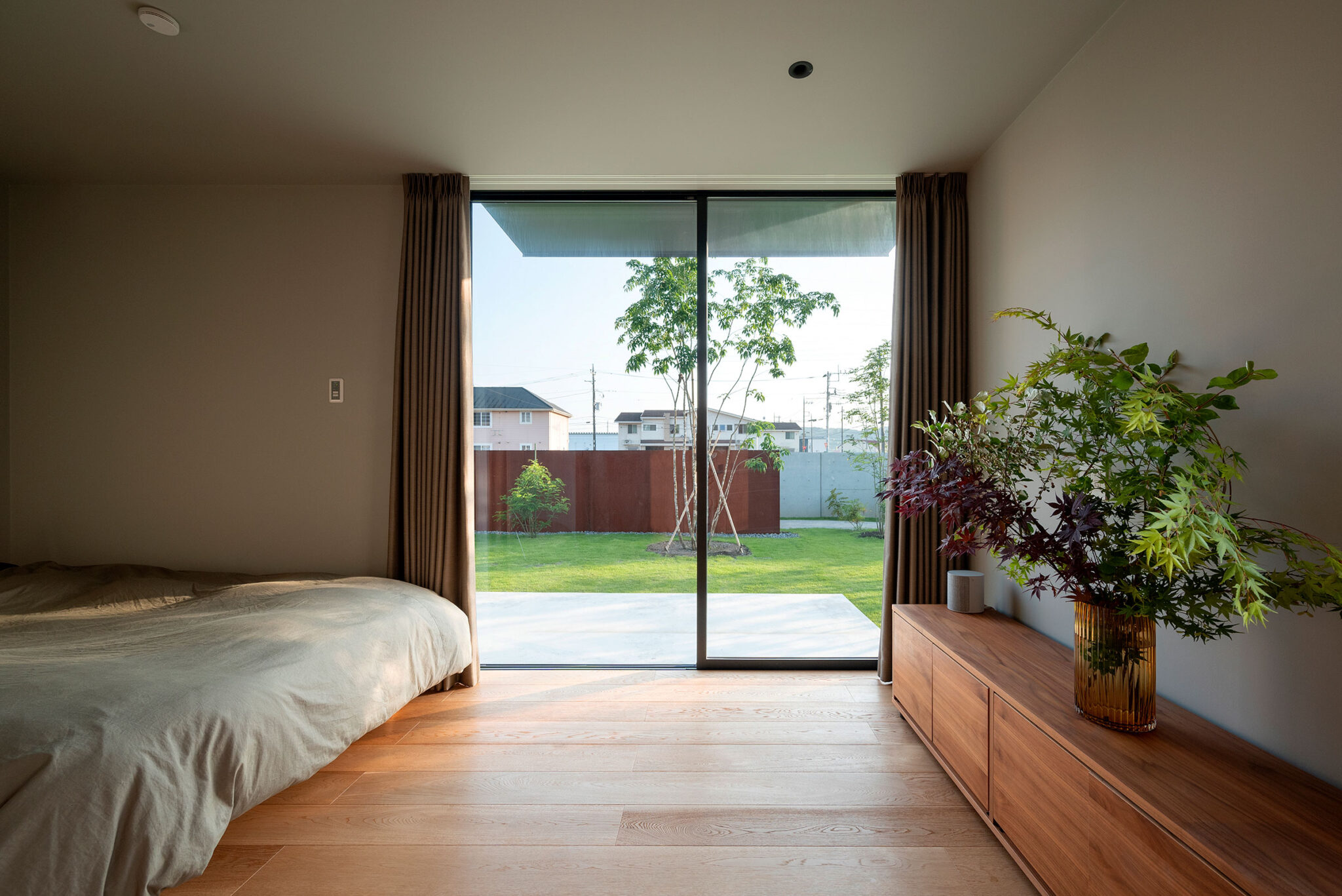 押山剛司建築設計事務所による「栃木の家」。戸建てと田んぼが入り混じる住宅街の敷地。植物や庭いじりが好きな施主の為に、個性的な複数の庭と建築が“絡み合う”ような平面構成を志向。箱形をベースとして“スタックとシフト”を繰り返して造り上げる1階、寝室 photo©渡邊崚生