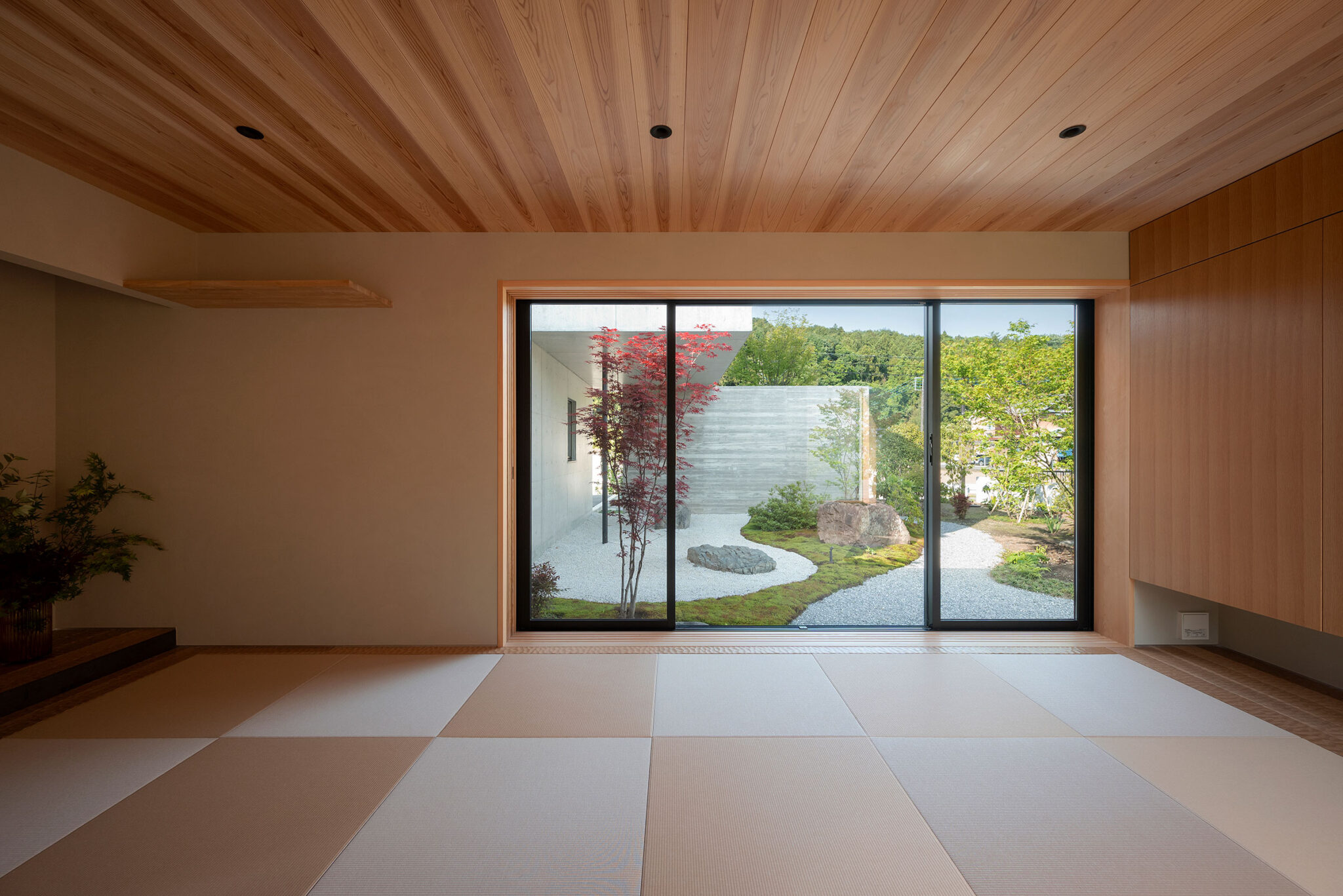 押山剛司建築設計事務所による「栃木の家」。戸建てと田んぼが入り混じる住宅街の敷地。植物や庭いじりが好きな施主の為に、個性的な複数の庭と建築が“絡み合う”ような平面構成を志向。箱形をベースとして“スタックとシフト”を繰り返して造り上げる1階、和室 photo©渡邊崚生