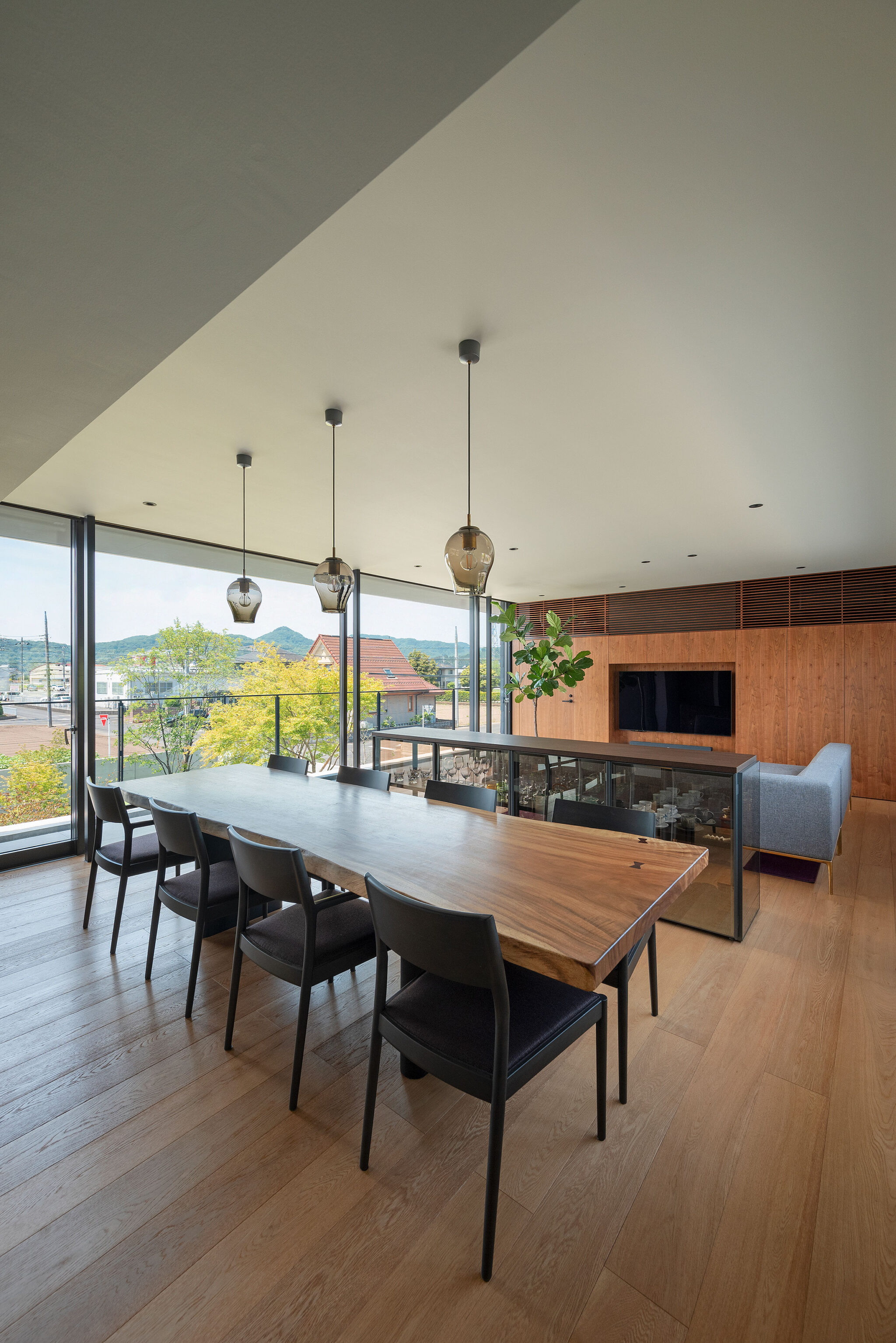 押山剛司建築設計事務所による「栃木の家」。戸建てと田んぼが入り混じる住宅街の敷地。植物や庭いじりが好きな施主の為に、個性的な複数の庭と建築が“絡み合う”ような平面構成を志向。箱形をベースとして“スタックとシフト”を繰り返して造り上げる2階、ダイニングからリビングを見る。 photo©渡邊崚生