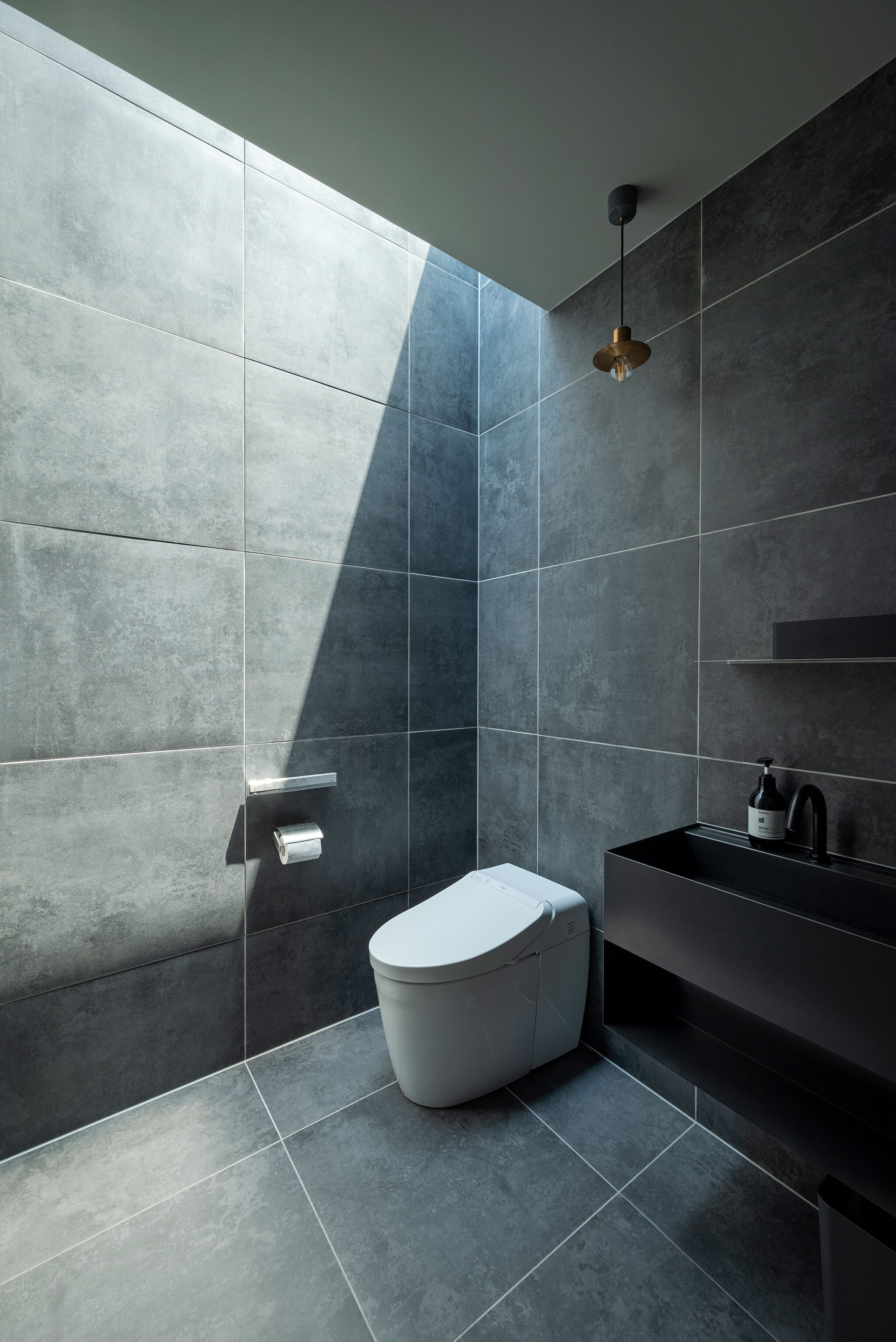 押山剛司建築設計事務所による「栃木の家」。戸建てと田んぼが入り混じる住宅街の敷地。植物や庭いじりが好きな施主の為に、個性的な複数の庭と建築が“絡み合う”ような平面構成を志向。箱形をベースとして“スタックとシフト”を繰り返して造り上げる2階、トイレ photo©渡邊崚生