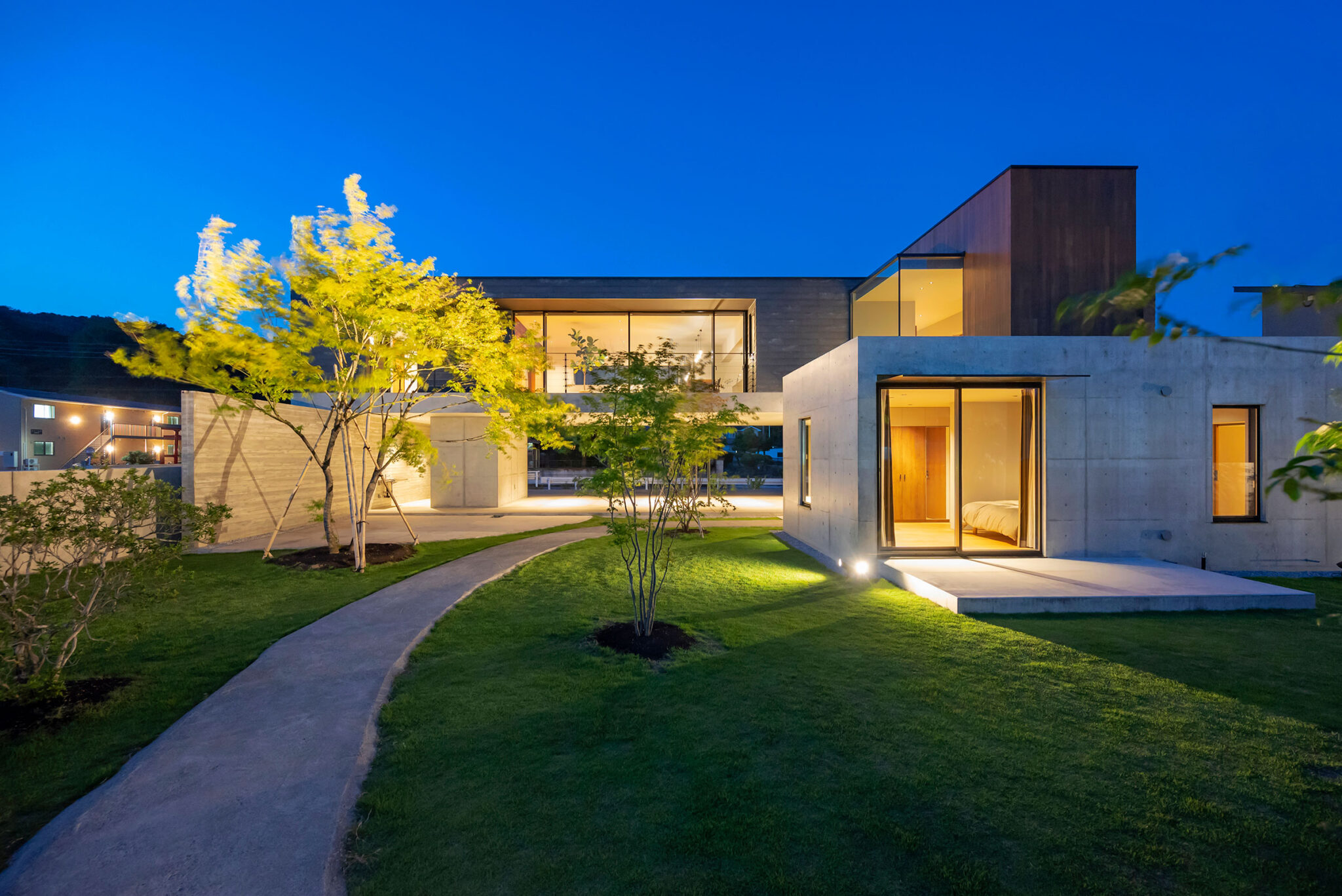 押山剛司建築設計事務所による「栃木の家」。戸建てと田んぼが入り混じる住宅街の敷地。植物や庭いじりが好きな施主の為に、個性的な複数の庭と建築が“絡み合う”ような平面構成を志向。箱形をベースとして“スタックとシフト”を繰り返して造り上げる外観、南西側の庭より見る。夜景 photo©渡邊崚生