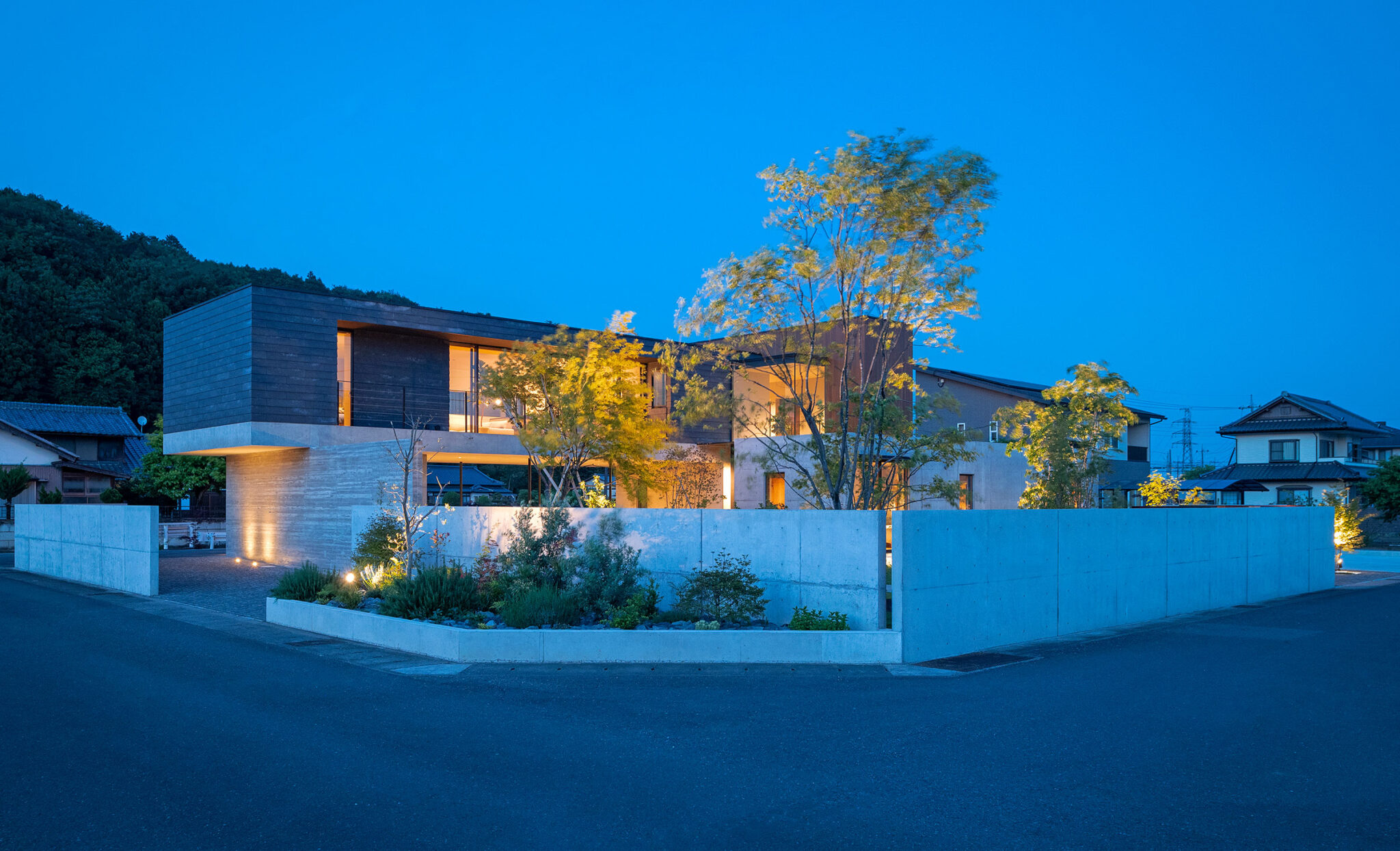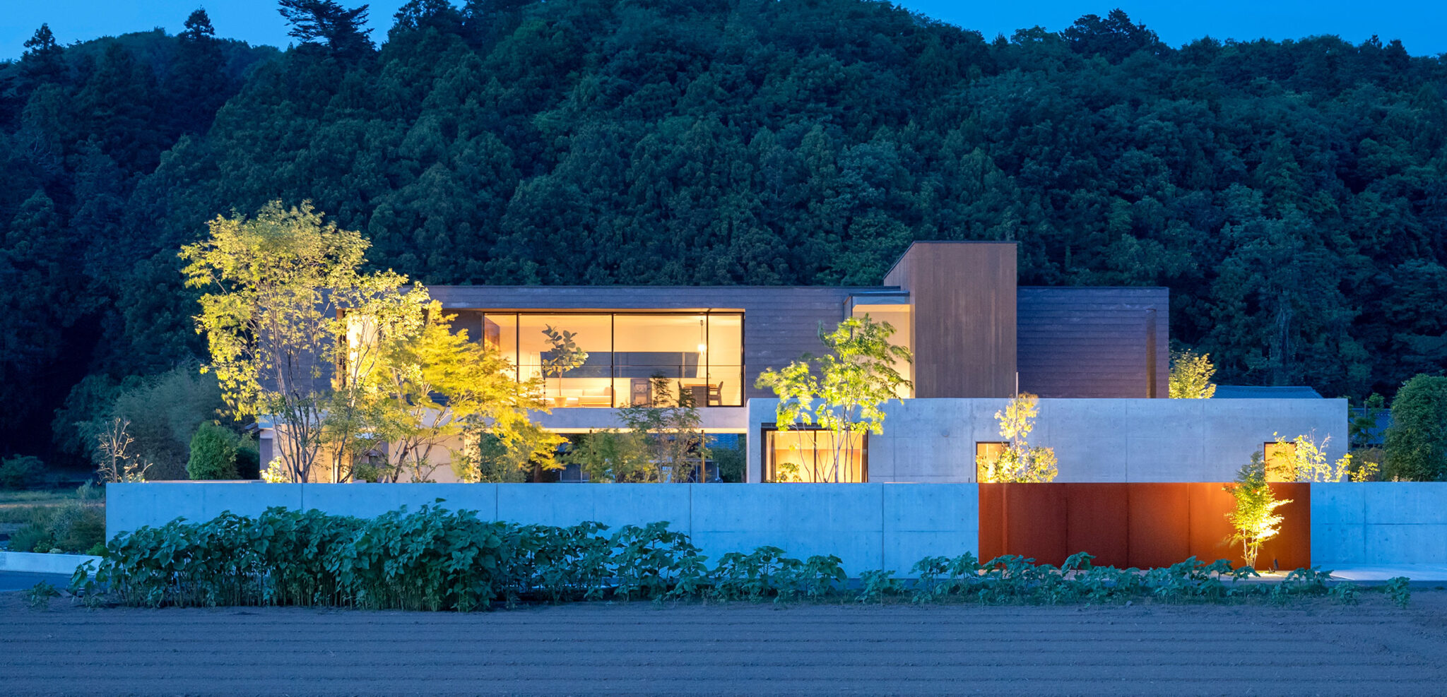 押山剛司建築設計事務所による「栃木の家」。戸建てと田んぼが入り混じる住宅街の敷地。植物や庭いじりが好きな施主の為に、個性的な複数の庭と建築が“絡み合う”ような平面構成を志向。箱形をベースとして“スタックとシフト”を繰り返して造り上げる外観、南西側の道路より見る。夜景 photo©渡邊崚生