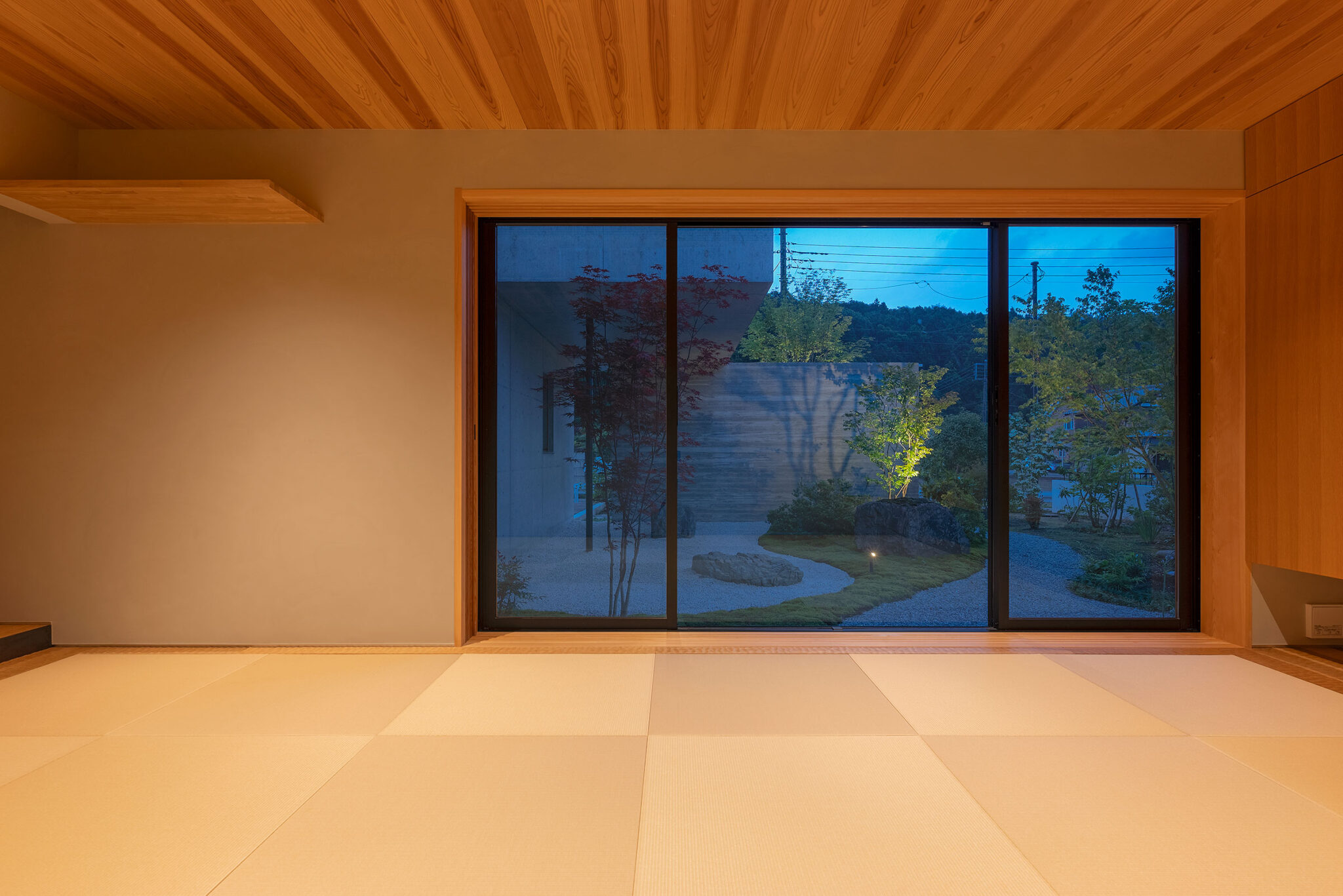 押山剛司建築設計事務所による「栃木の家」。戸建てと田んぼが入り混じる住宅街の敷地。植物や庭いじりが好きな施主の為に、個性的な複数の庭と建築が“絡み合う”ような平面構成を志向。箱形をベースとして“スタックとシフト”を繰り返して造り上げる1階、和室。夜景 photo©渡邊崚生