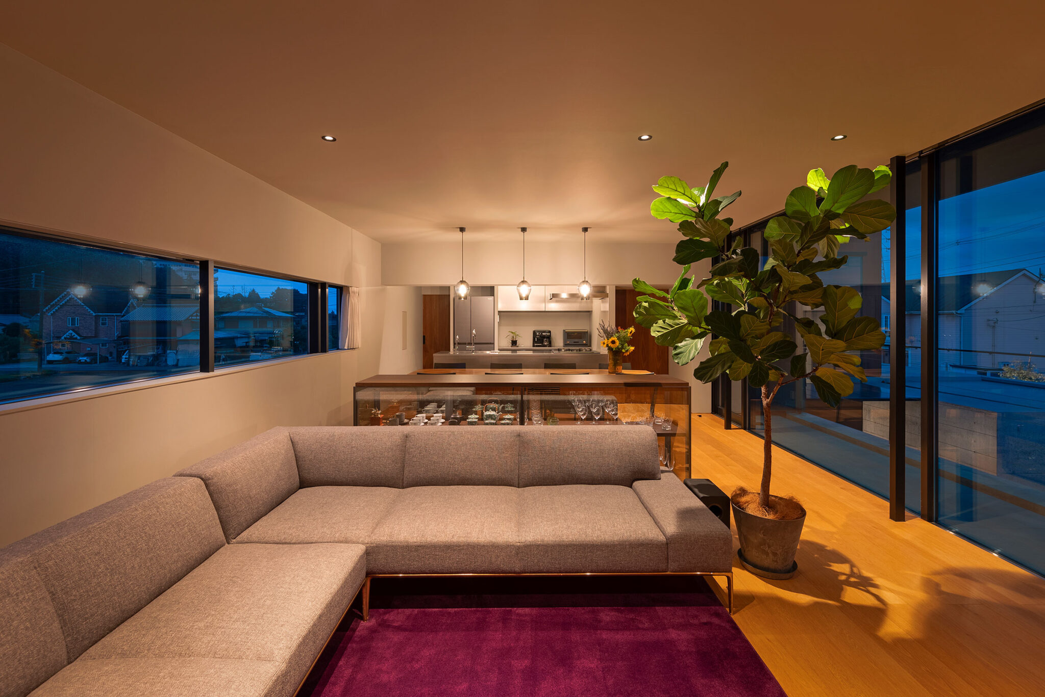 押山剛司建築設計事務所による「栃木の家」。戸建てと田んぼが入り混じる住宅街の敷地。植物や庭いじりが好きな施主の為に、個性的な複数の庭と建築が“絡み合う”ような平面構成を志向。箱形をベースとして“スタックとシフト”を繰り返して造り上げる2階、リビングからダイニングとキッチンを見る。夜景 photo©渡邊崚生