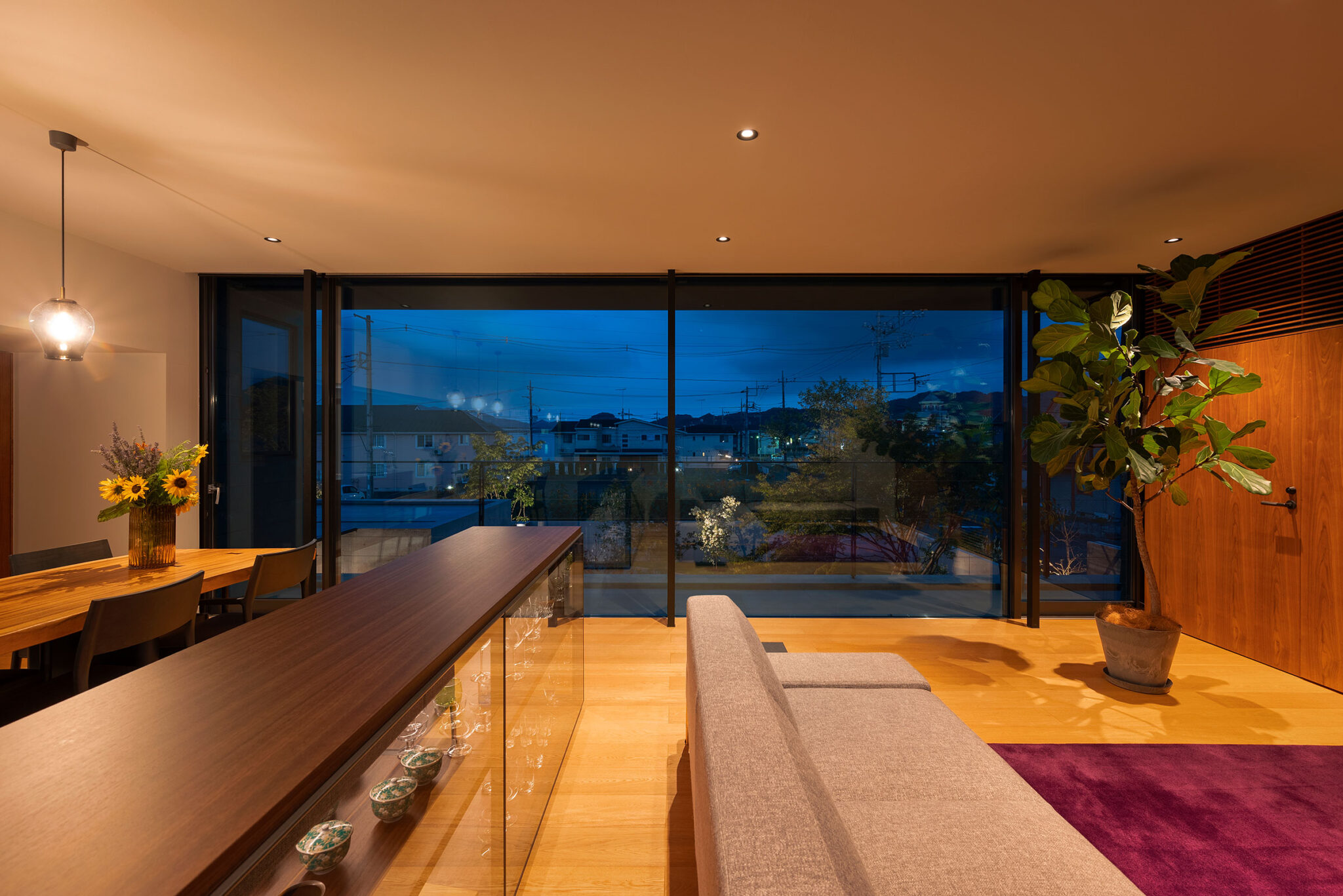 押山剛司建築設計事務所による「栃木の家」。戸建てと田んぼが入り混じる住宅街の敷地。植物や庭いじりが好きな施主の為に、個性的な複数の庭と建築が“絡み合う”ような平面構成を志向。箱形をベースとして“スタックとシフト”を繰り返して造り上げる2階、左:ダイニング、右:リビング。夜景 photo©渡邊崚生