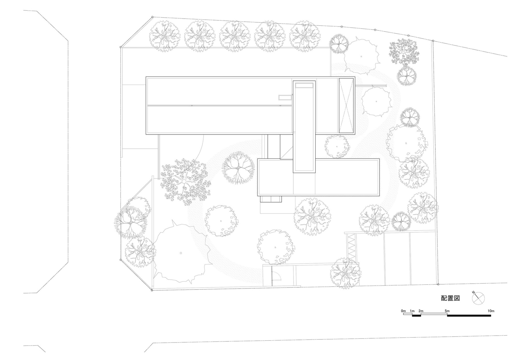 また、要求されたボリュームに対して敷地面積が十分にあったので、建築と庭が一対の関係である所謂「庭付きの住宅」とは違い、敷地内での建築と余白の関係、ひいては周辺の空地との関係が豊かになる建築にしようと考えた。