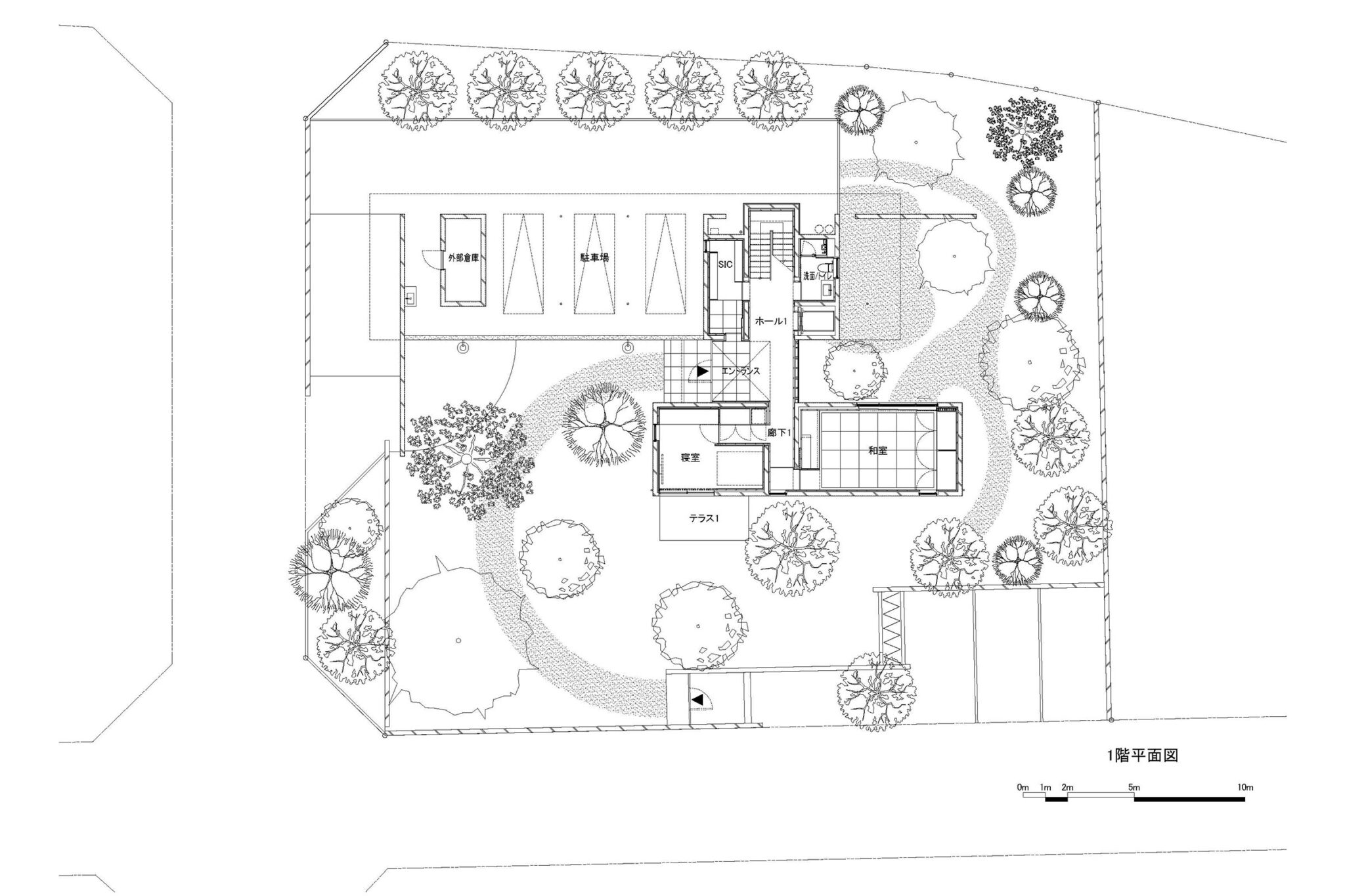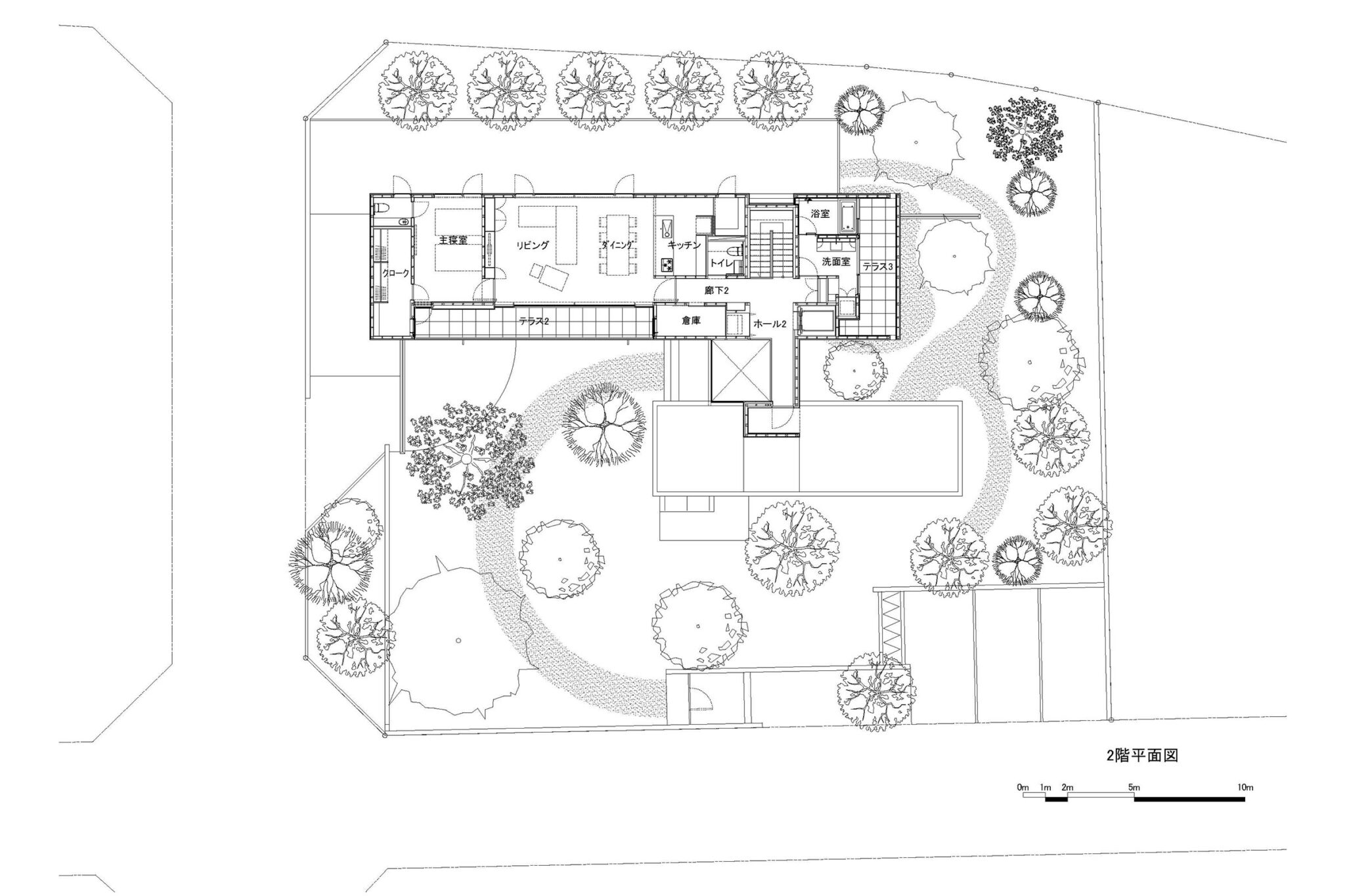 スタディの過程において創出された、大きな円弧を描くアプローチのある庭、和室のための北側の庭、寝室からお気に入りの木を愛でる庭などの個性的な庭たちと、それに絡み合うような平面計画は庭と建築の関係を豊かにし、アプローチや和室の庭に張り出すキャンチレバーのボリュームは、建築をアイコニックで個性的なものへと昇華させた。