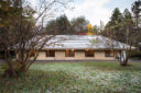 青柳創と青柳綾夏による、岩手の「金ケ崎の家」。寄棟屋根や左官真壁の採用が必須な地域。意思と無関係に“外形が決まる”状況に対し、通常と異なり“内部の空洞”の支え方を思考せざる負えない設計過程に着目。空洞を実態に変質させるべく極細列柱の構造体を考案外観、東側より見る。 photo©太田拓実