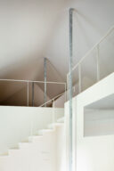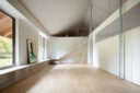 青柳創と青柳綾夏による、岩手の「金ケ崎の家」。寄棟屋根や左官真壁の採用が必須な地域。意思と無関係に“外形が決まる”状況に対し、通常と異なり“内部の空洞”の支え方を思考せざる負えない設計過程に着目。空洞を実態に変質させるべく極細列柱の構造体を考案1階、住宅部分、リビングから2階への階段を見る。 photo©太田拓実