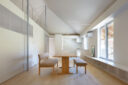 青柳創と青柳綾夏による、岩手の「金ケ崎の家」。寄棟屋根や左官真壁の採用が必須な地域。意思と無関係に“外形が決まる”状況に対し、通常と異なり“内部の空洞”の支え方を思考せざる負えない設計過程に着目。空洞を実態に変質させるべく極細列柱の構造体を考案1階、住宅部分、リビングからダイニングとキッチンを見る。 photo©太田拓実