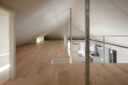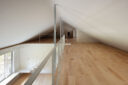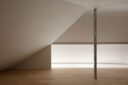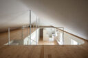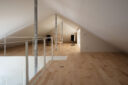 青柳創と青柳綾夏による、岩手の「金ケ崎の家」。寄棟屋根や左官真壁の採用が必須な地域。意思と無関係に“外形が決まる”状況に対し、通常と異なり“内部の空洞”の支え方を思考せざる負えない設計過程に着目。空洞を実態に変質させるべく極細列柱の構造体を考案2階、住宅部分、小屋裏 photo©太田拓実