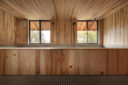 青柳創と青柳綾夏による、岩手の「金ケ崎の家」。寄棟屋根や左官真壁の採用が必須な地域。意思と無関係に“外形が決まる”状況に対し、通常と異なり“内部の空洞”の支え方を思考せざる負えない設計過程に着目。空洞を実態に変質させるべく極細列柱の構造体を考案2階、住宅部分、小屋裏から吹抜を見る。 photo©太田拓実