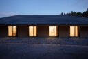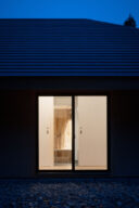 青柳創と青柳綾夏による、岩手の「金ケ崎の家」。寄棟屋根や左官真壁の採用が必須な地域。意思と無関係に“外形が決まる”状況に対し、通常と異なり“内部の空洞”の支え方を思考せざる負えない設計過程に着目。空洞を実態に変質させるべく極細列柱の構造体を考案外観、西側より見る。夜景 photo©太田拓実