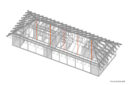 まず、垂木・母屋・束を省略し、水平距離3640mmある棟木と軒桁の間に105×210の登梁を架け渡した。大きな屋根荷重を支える105×270の棟木は、5本の鉄骨柱で支持されている。鉄骨柱の断面は□-60x60x4.5、全長は約4600mm、細長比は200を超えている。細柱は桁の高さで木造部分に腕を出し座屈を拘束している。小屋組の存在感は極細の鉄骨柱に集約された。