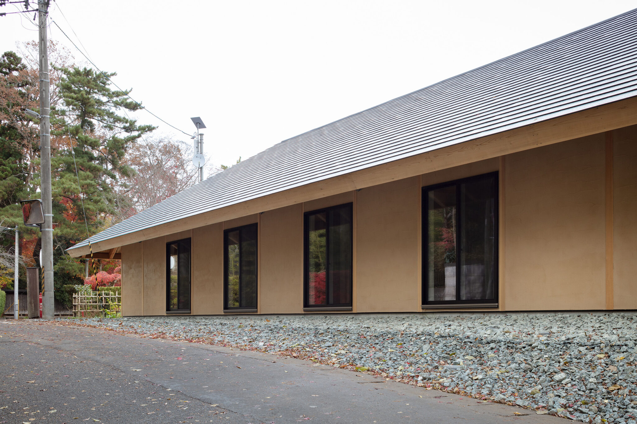 青柳創と青柳綾夏による、岩手の「金ケ崎の家」。寄棟屋根や左官真壁の採用が必須な地域。意思と無関係に“外形が決まる”状況に対し、通常と異なり“内部の空洞”の支え方を思考せざる負えない設計過程に着目。空洞を実態に変質させるべく極細列柱の構造体を考案外観、東側より見る。 photo©太田拓実