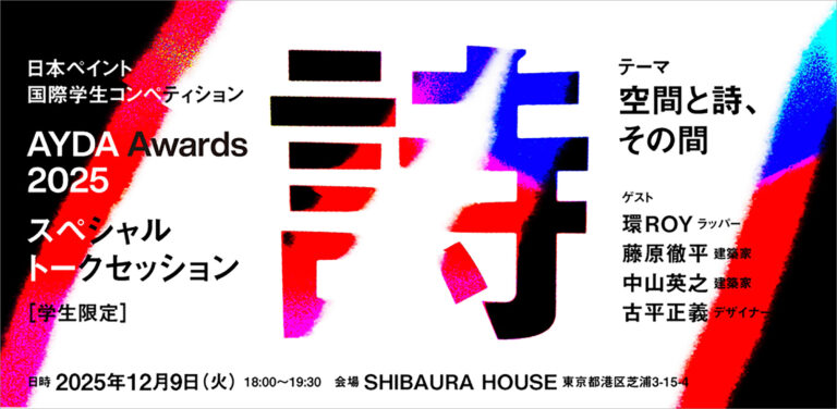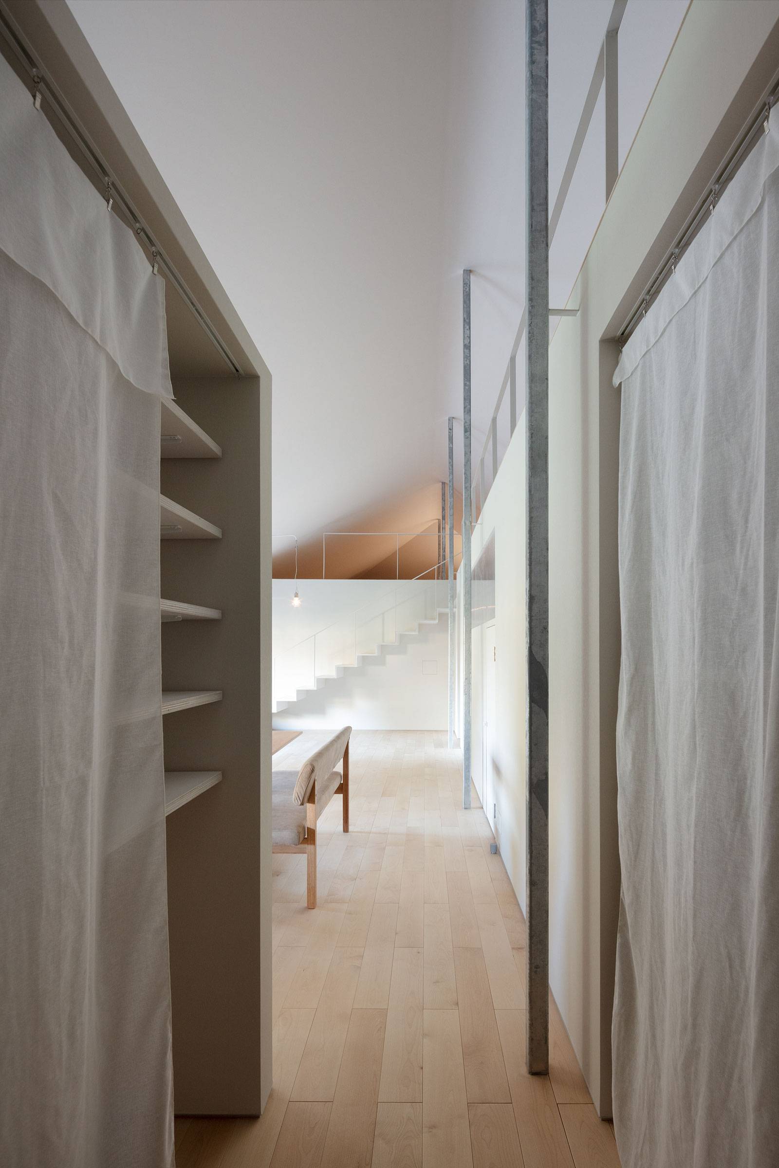 青柳創と青柳綾夏による、岩手の「金ケ崎の家」。寄棟屋根や左官真壁の採用が必須な地域。意思と無関係に“外形が決まる”状況に対し、通常と異なり“内部の空洞”の支え方を思考せざる負えない設計過程に着目。空洞を実態に変質させるべく極細列柱の構造体を考案2階、住宅部分、小屋裏から吹抜を見る。 photo©太田拓実