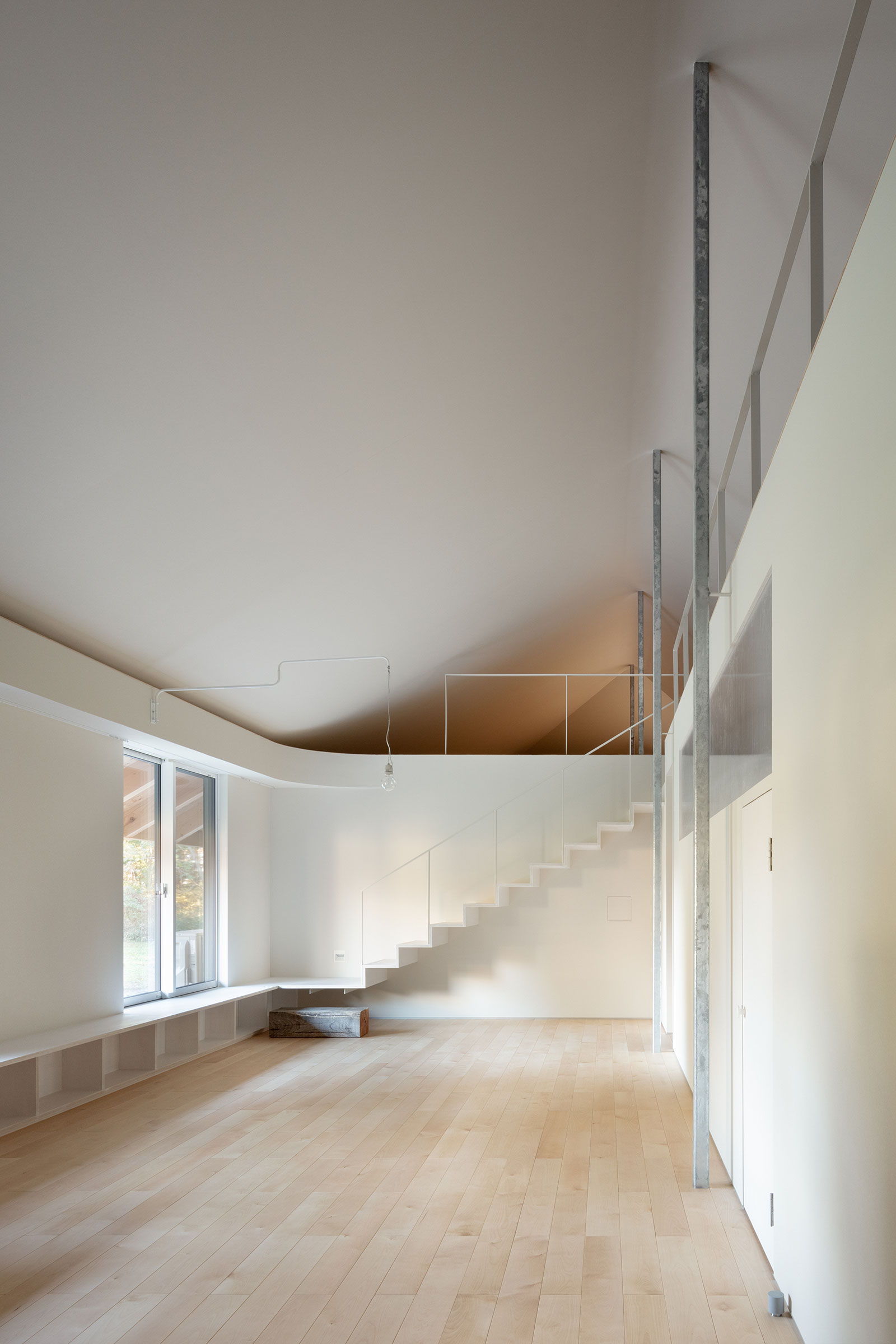 青柳創と青柳綾夏による、岩手の「金ケ崎の家」。寄棟屋根や左官真壁の採用が必須な地域。意思と無関係に“外形が決まる”状況に対し、通常と異なり“内部の空洞”の支え方を思考せざる負えない設計過程に着目。空洞を実態に変質させるべく極細列柱の構造体を考案1階、住宅部分、リビングから2階への階段を見る。 photo©太田拓実