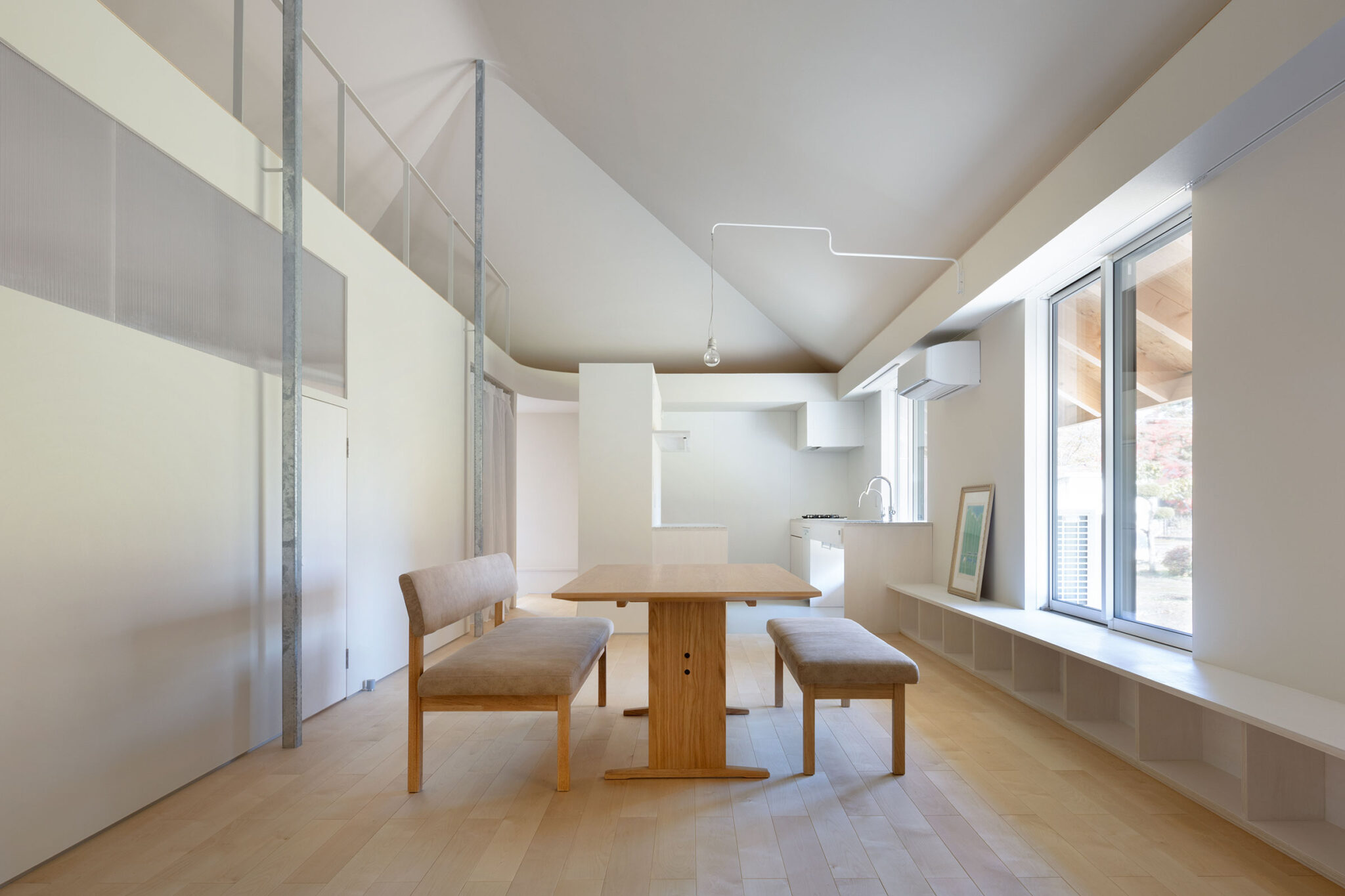 青柳創と青柳綾夏による、岩手の「金ケ崎の家」。寄棟屋根や左官真壁の採用が必須な地域。意思と無関係に“外形が決まる”状況に対し、通常と異なり“内部の空洞”の支え方を思考せざる負えない設計過程に着目。空洞を実態に変質させるべく極細列柱の構造体を考案1階、住宅部分、リビングからダイニングとキッチンを見る。 photo©太田拓実