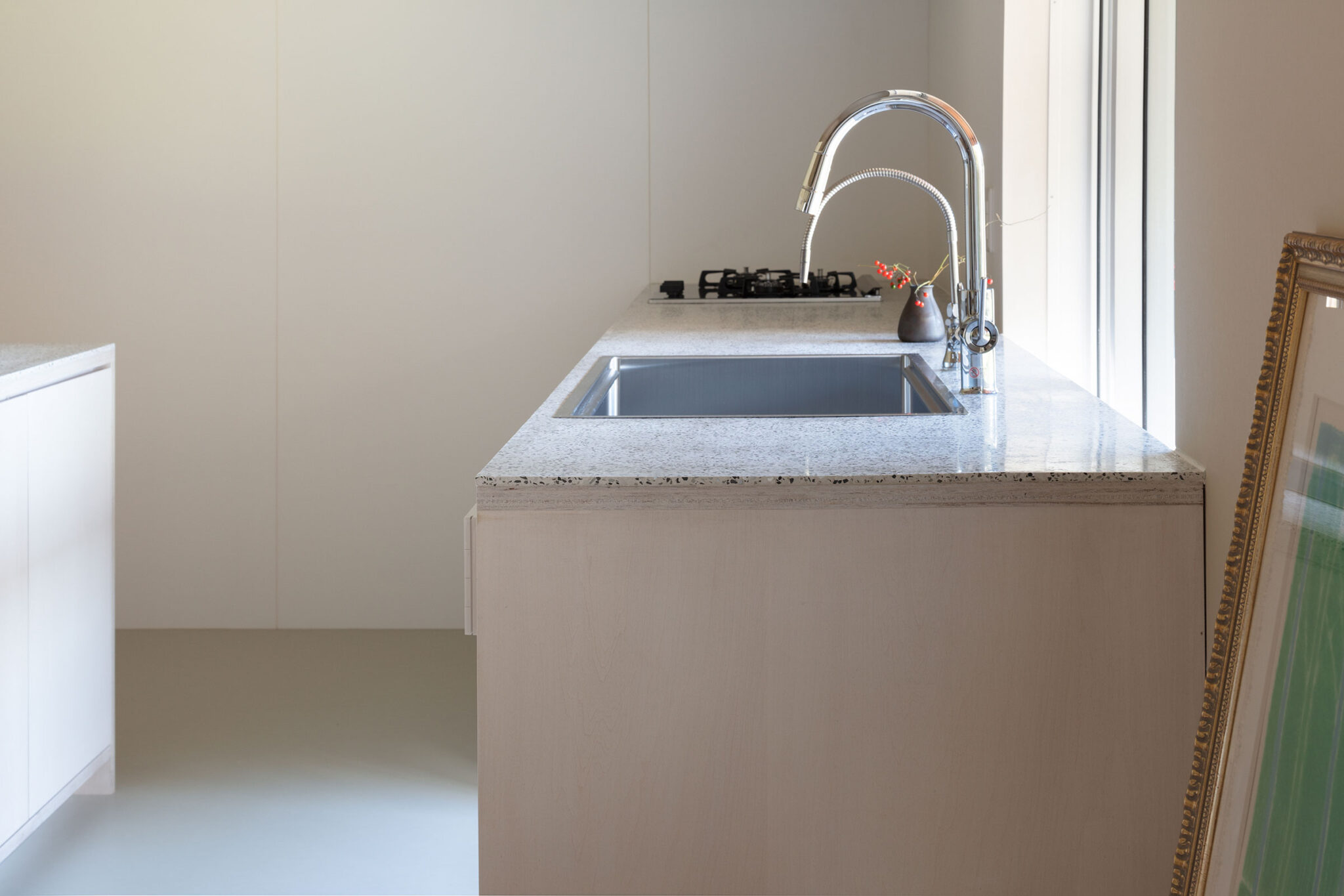 青柳創と青柳綾夏による、岩手の「金ケ崎の家」。寄棟屋根や左官真壁の採用が必須な地域。意思と無関係に“外形が決まる”状況に対し、通常と異なり“内部の空洞”の支え方を思考せざる負えない設計過程に着目。空洞を実態に変質させるべく極細列柱の構造体を考案1階、住宅部分、キッチン photo©太田拓実