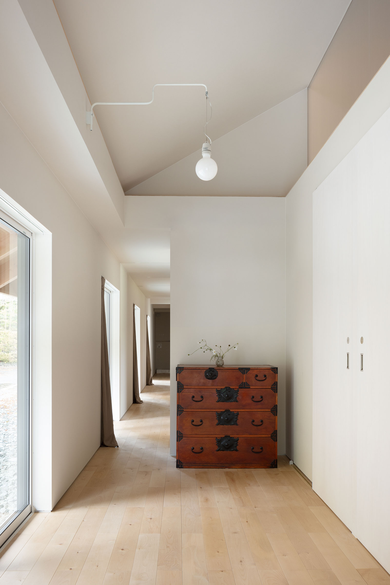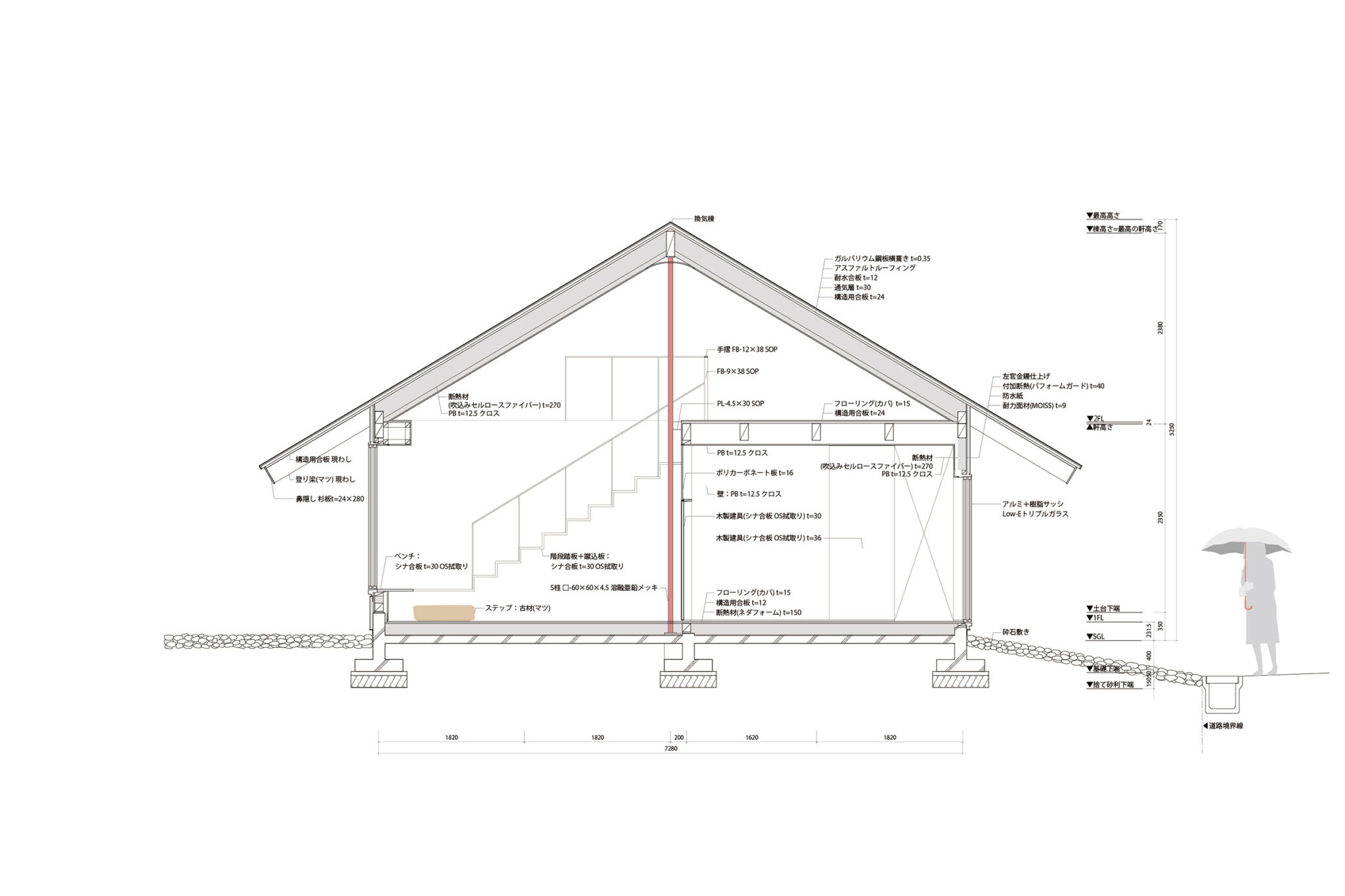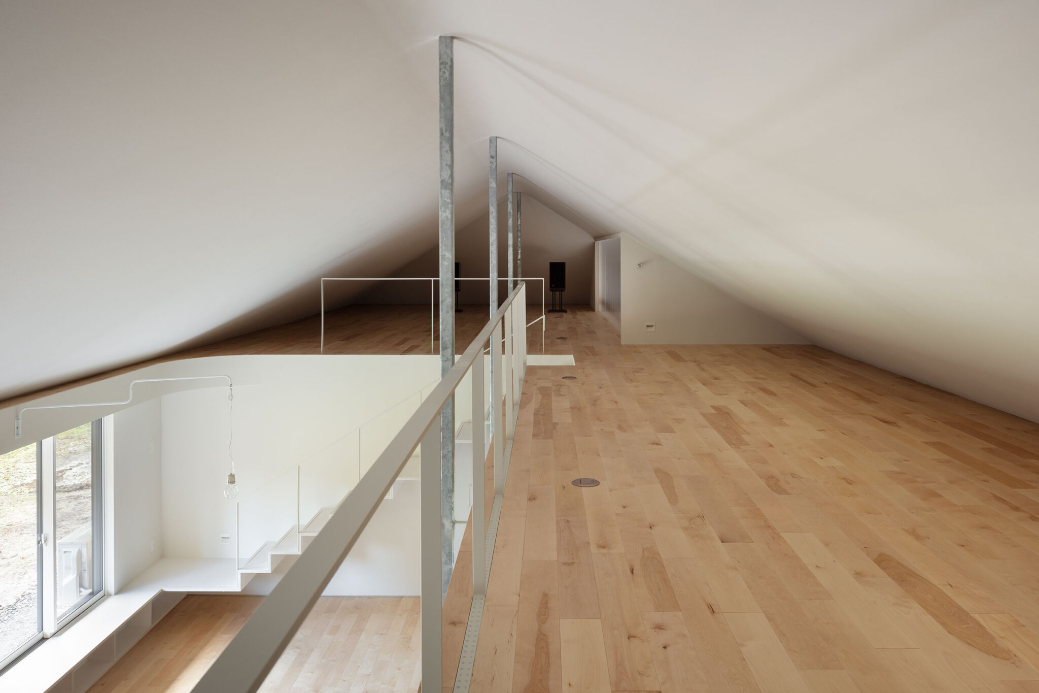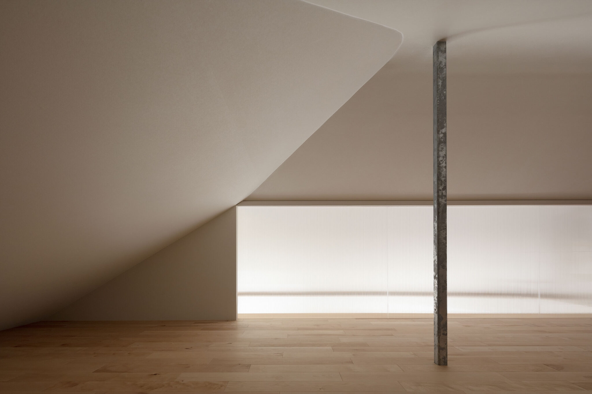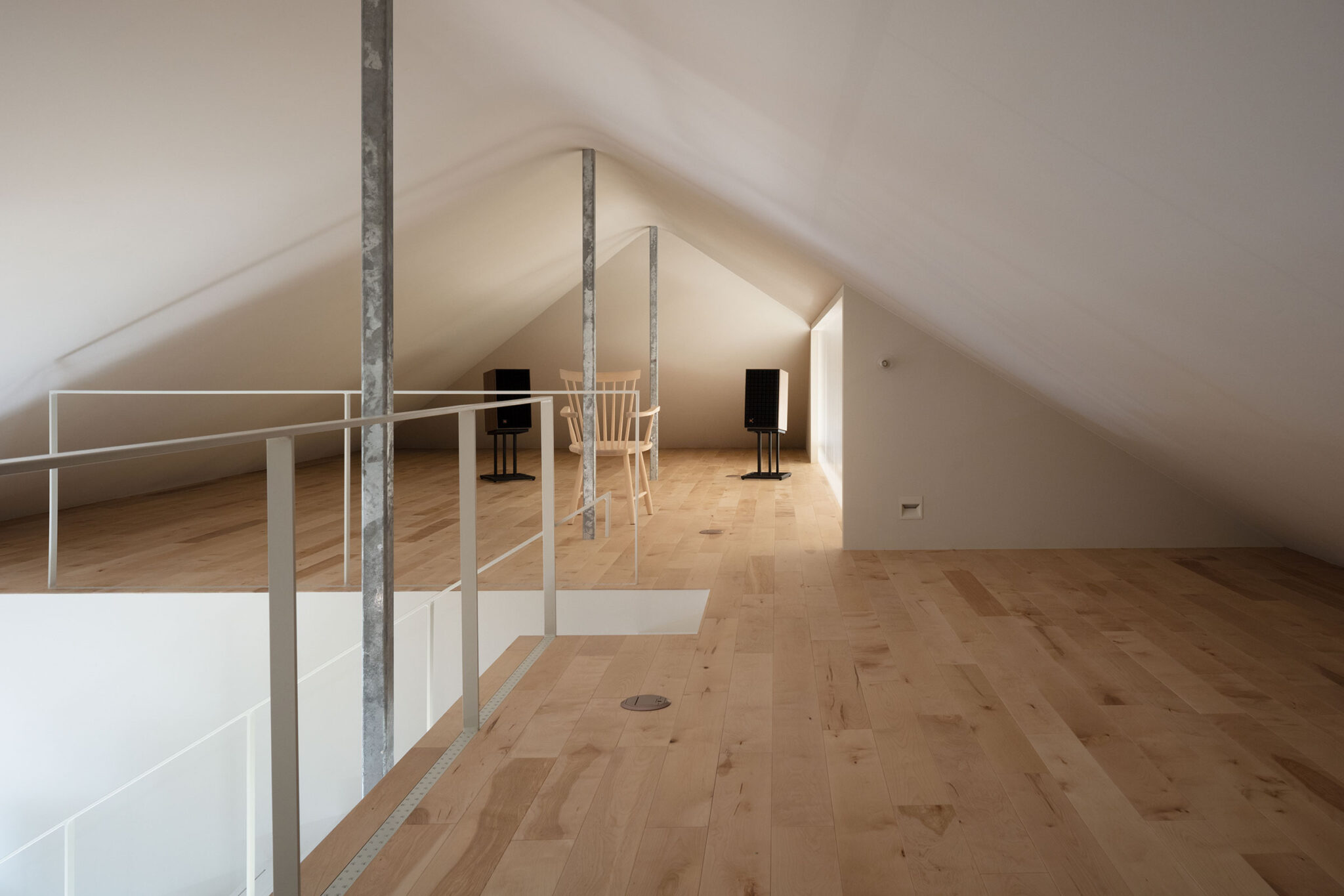 大きな寄棟屋根が特徴的なこの建物は、外観から想像する通り内部に大きな小屋裏空間を有している。小屋裏には梁や束などの小屋組が密に配置される伝統木造の既視感に対し、「空洞」としての概念を体現すべく、小屋組の要素を極限まで減らすことにした。