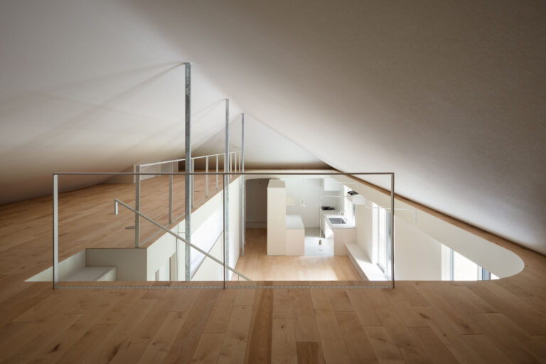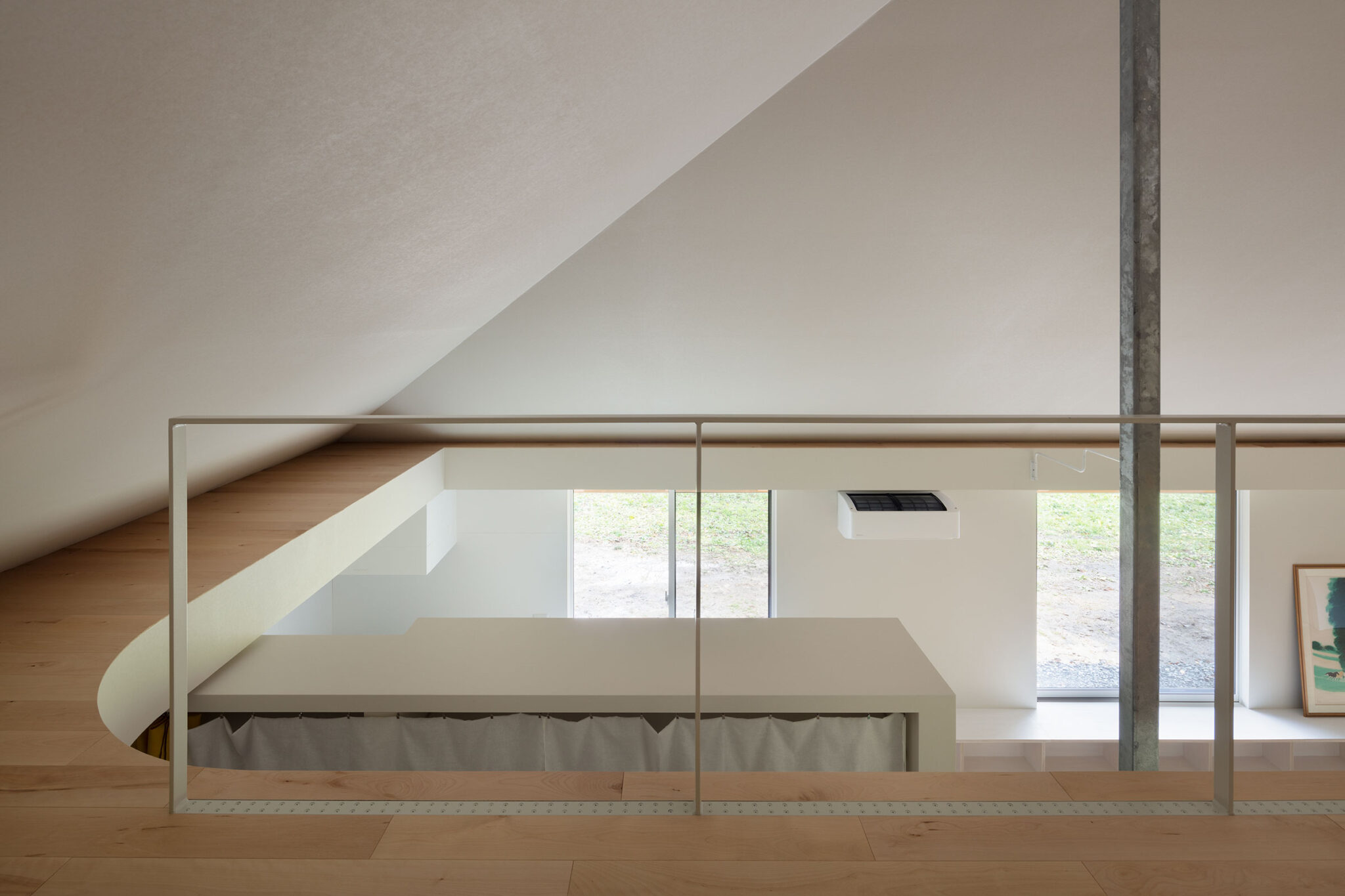 青柳創と青柳綾夏による、岩手の「金ケ崎の家」。寄棟屋根や左官真壁の採用が必須な地域。意思と無関係に“外形が決まる”状況に対し、通常と異なり“内部の空洞”の支え方を思考せざる負えない設計過程に着目。空洞を実態に変質させるべく極細列柱の構造体を考案2階、住宅部分、小屋裏 photo©太田拓実
