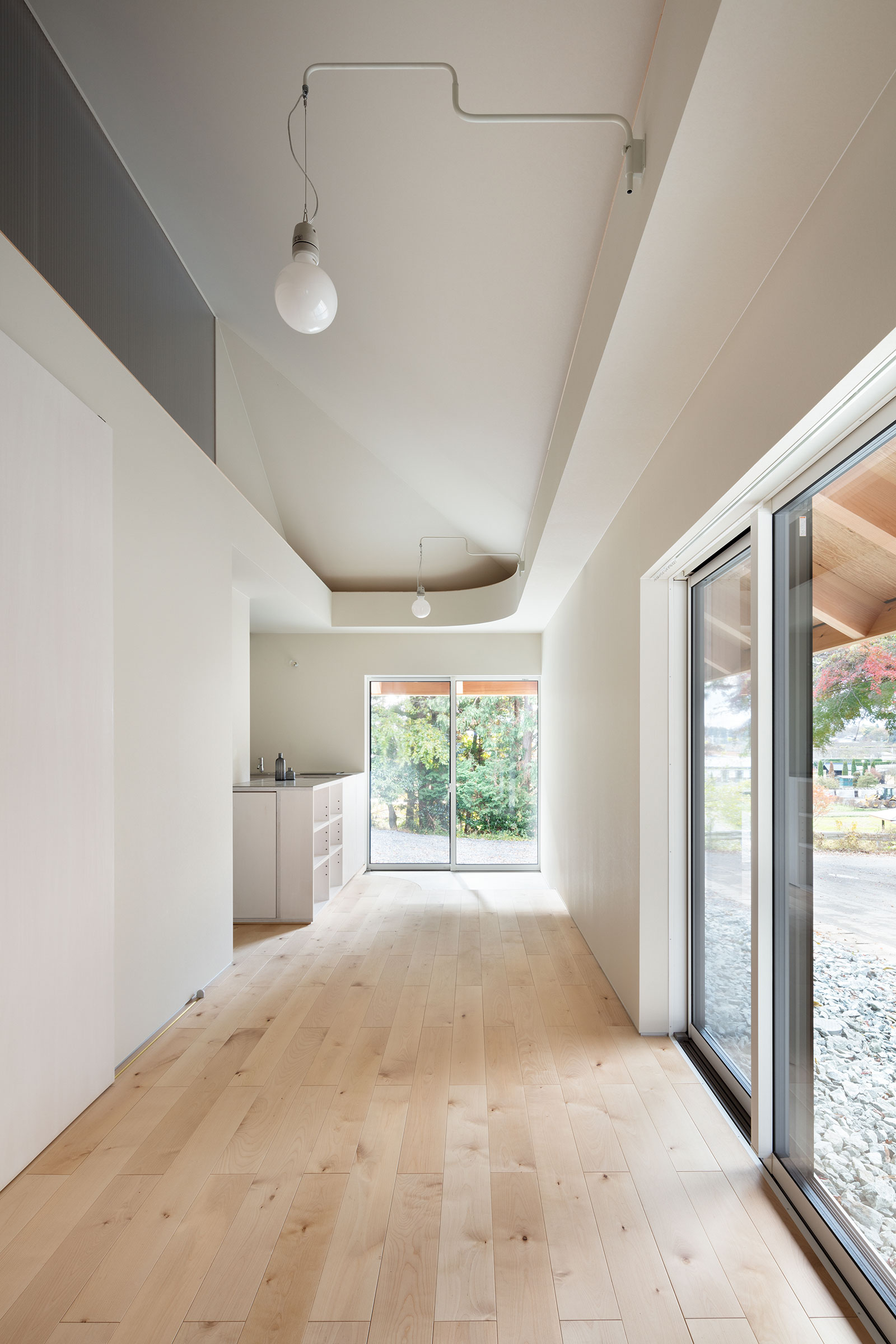 青柳創と青柳綾夏による、岩手の「金ケ崎の家」。寄棟屋根や左官真壁の採用が必須な地域。意思と無関係に“外形が決まる”状況に対し、通常と異なり“内部の空洞”の支え方を思考せざる負えない設計過程に着目。空洞を実態に変質させるべく極細列柱の構造体を考案1階、住宅部分、玄関側からリビングダイニング側を見る。 photo©太田拓実